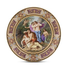 Porcellana policroma e dorata. Marca: pseudo marca di Vienna. Diametro cm 24,8. Conservazione: ottima