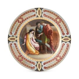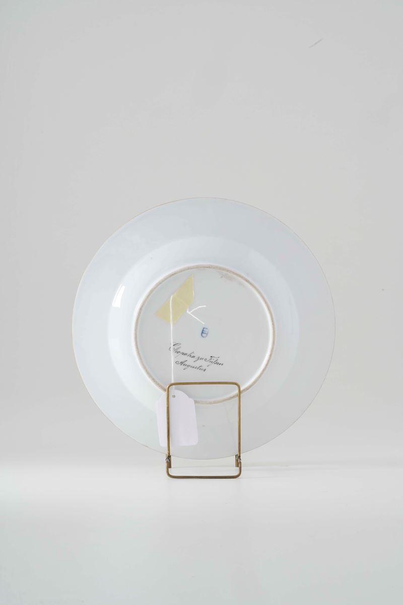 Porcellana decorata in policromia e dorata. Marca: pseudo marca di Vienna con scudo in blu. Diametro cm 24,4. Conservazione: ottima