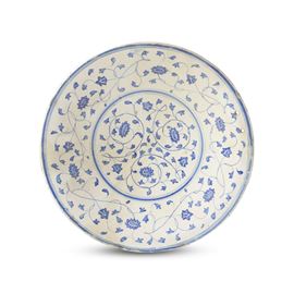 Piatto a profilo svasato, ad orlo rilevato e piede a cercine. Nel recto si dispone una decorazione di sottili tralci a girali con foglie e corolle; nel verso, che è smaltato, sono tracciate la segnatura “SP” e delle filettature attorno al piede e verso l’orlo. Dipinto in monocroma azzurra