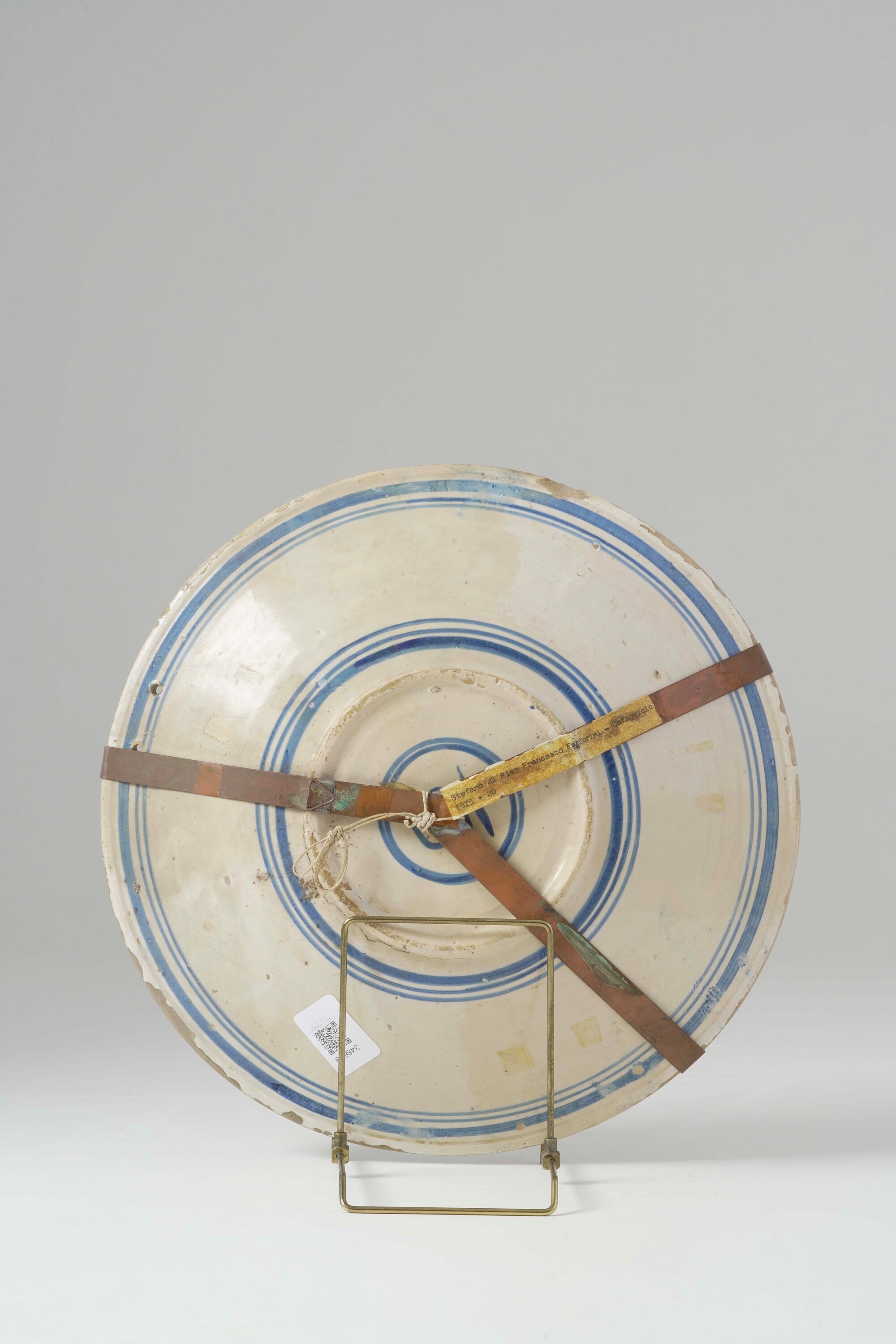 Quest’opera rappresenta un tassello molto significativo della produzione della fornace mugellana attiva nel castello di Cafaggiolo, che prese avvio alla fine del Quattrocento, producendo opere di grande eleganza tecnico-decorativa, ma avviandosi al declino dopo la metà del secolo successivo, cessando l’attività verso il 1570. Molto diffusa sin dal primo periodo fu la decorazione “alla porcellana”, cui appartiene anche quest’opera, nata sulle suggestioni del mondo orientale, rielaborate sino ad assumere caratteri assai peculiari e riconoscibili sui manufatti. Essa inoltre cronologicamente appartiene al primo periodo in ragione anche della segnatura “SP”, dipinta sul verso, finora unica marca certa della fornace mugellana