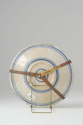 Maiolica. Dimensioni: diametro cm 33; altezza cm 5. Conservazione: rotto in più frammenti e ricomposto. Già collezione Della Gherardesca e coll. privata di Mantova.