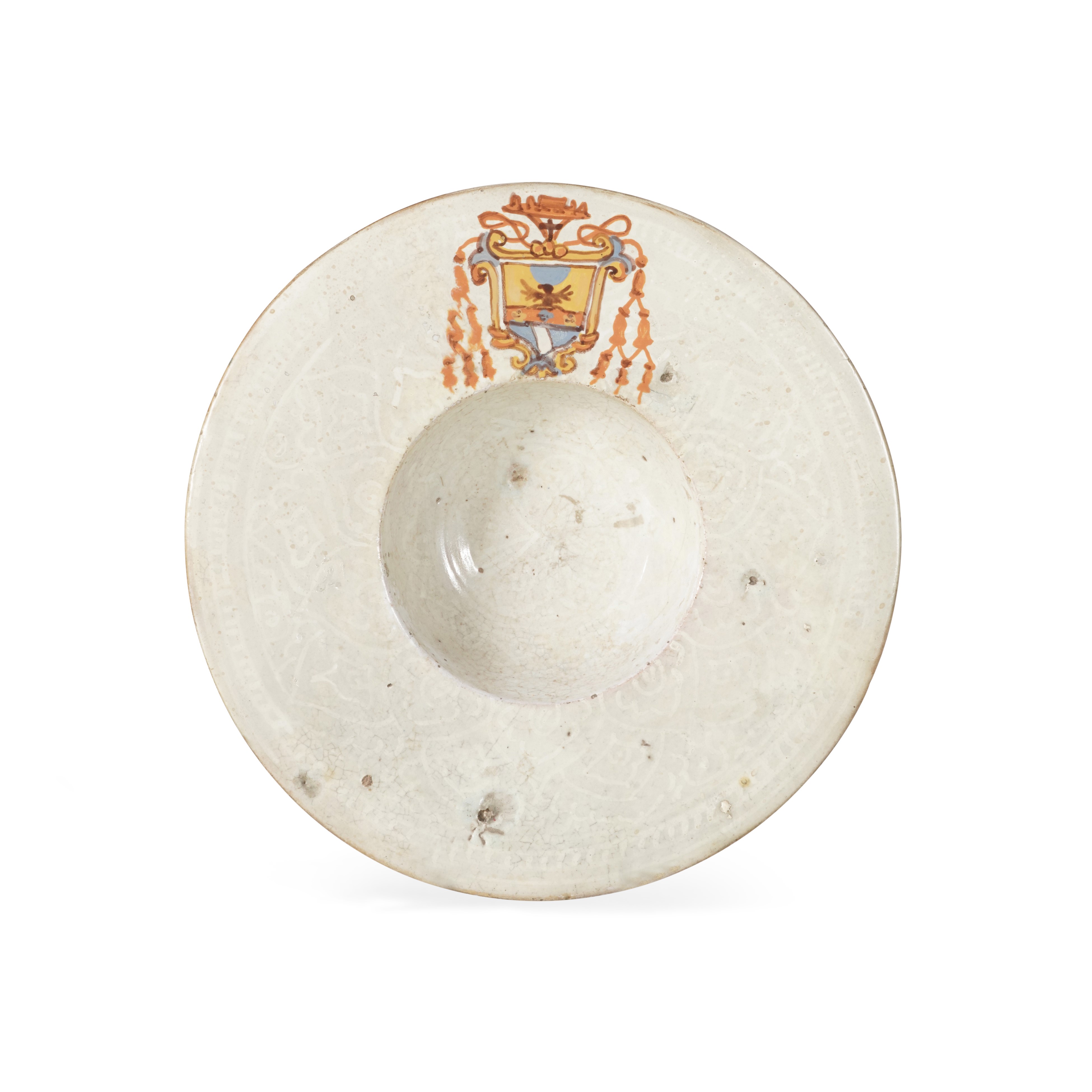 Piatto apodo, a cavetto fondo ed ampia tesa orizzontale. La superficie del recto ospita una decorazione “a rabesche”, tracciate in “bianco su bianco”, mentre in un punto della tesa è dipinto uno stemma prelatizio, composto da uno scudo araldico di foggia “sannitica”, sormontato da un cappello (galero), con cordoni a sei fiocchi, pendenti ai lati. Retro smaltato. Dipinto in arancione e azzurro solo nello stemma