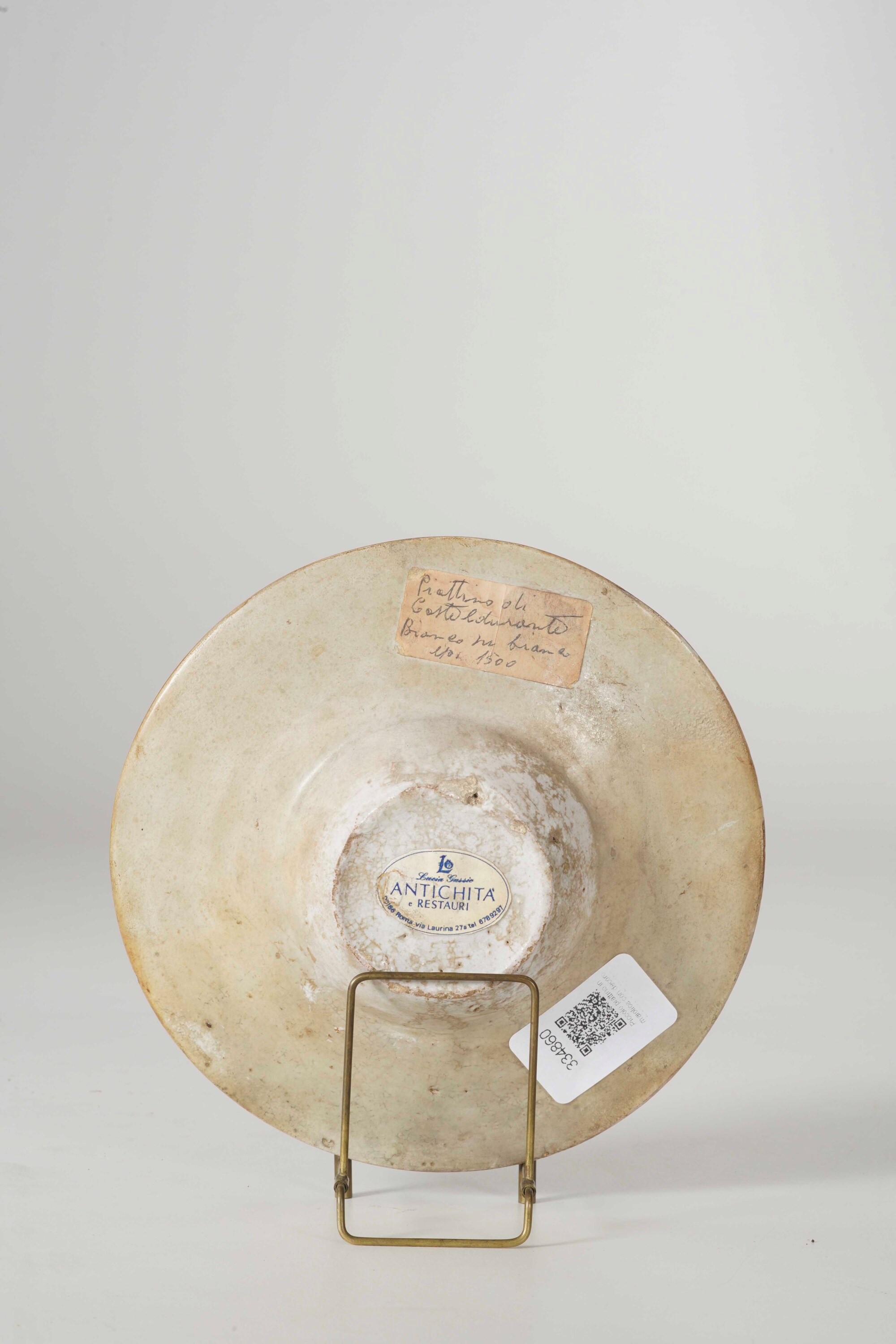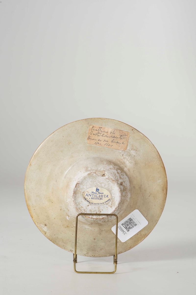 Maiolica. Dimensioni: altezza cm 3,3; diametro cm 16,3. Conservazione: diversi restauri; non si esclude che lo stemma possa essere stato dipinto successivamente. Sul verso, un cartellino indica “Lucia Gussio Antichità e restauri Roma”