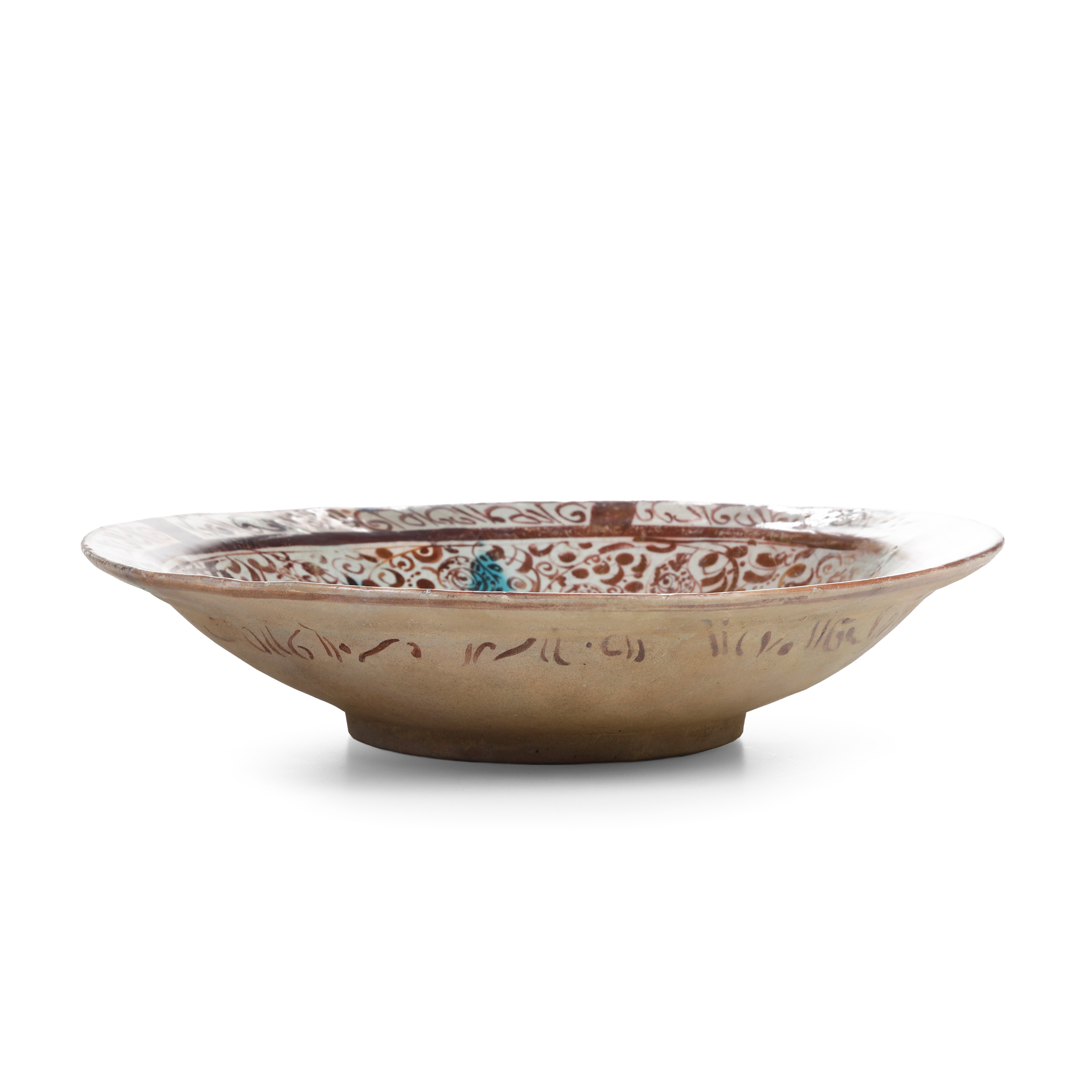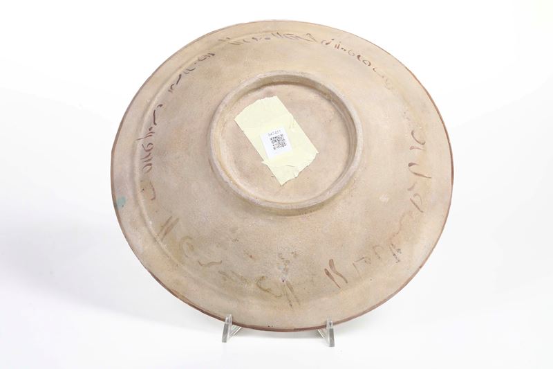Il piatto è dipinto al centro con figure non più leggibili, incorniciate da due fasce: una a volute e l'altra con un'iscrizione contenente una citazione coranica o una frase augurale (?)