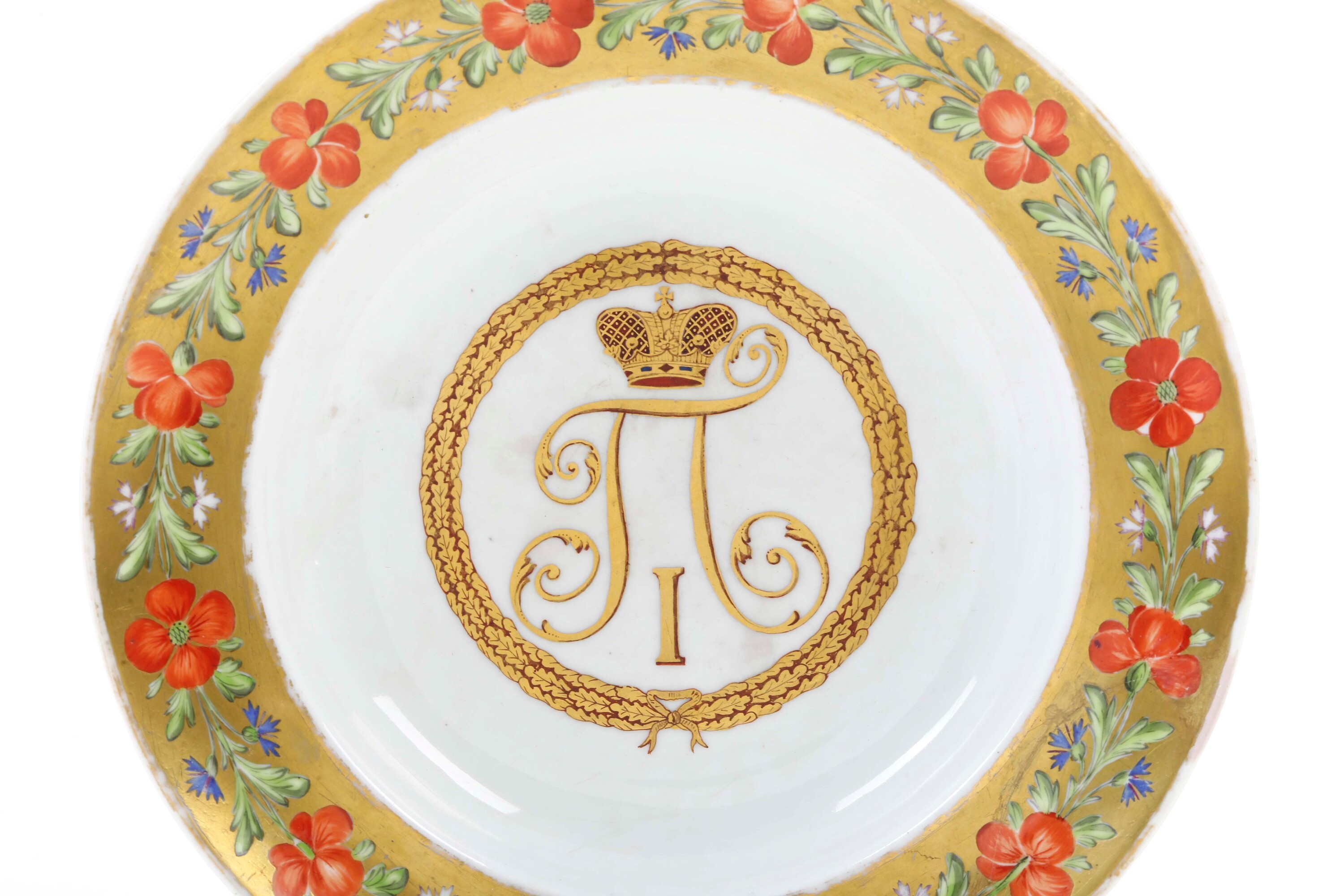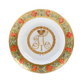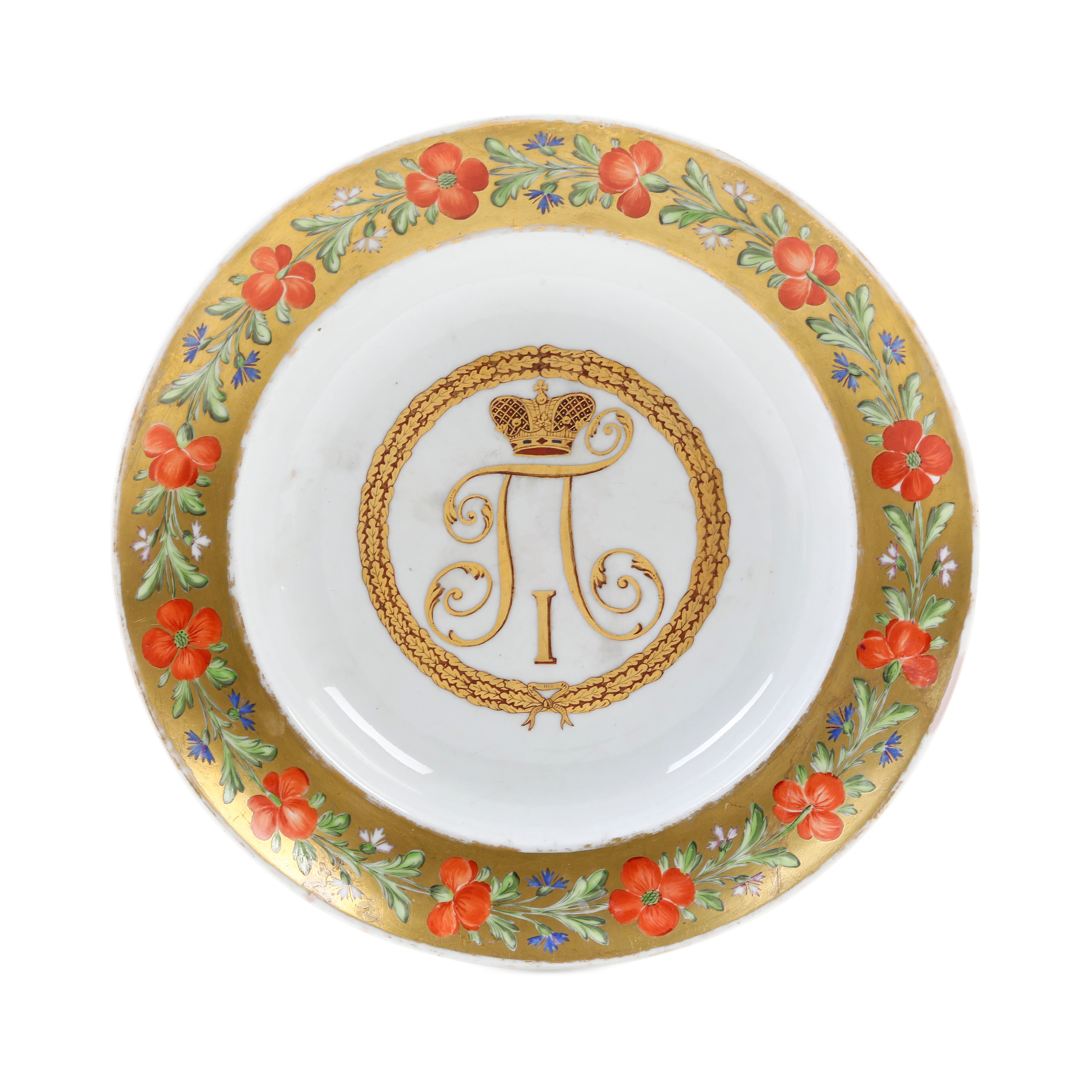 Al centro del piatto, nel cavetto, si trova il monogramma "P I" sormontato dalla corona imperiale russa, che si riferisce allo zar Paolo I di Russia (Paolo I Petrovič Romanov, imperatore dal 1796 al 1801, figlio dell'imperatrice Caterina II e dell'imperatore Pietro III), incorniciato da un nastro con foglie di quercia. Nella tradizione russa, la quercia simboleggia forza, longevità, nobiltà e coraggio.