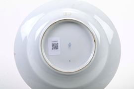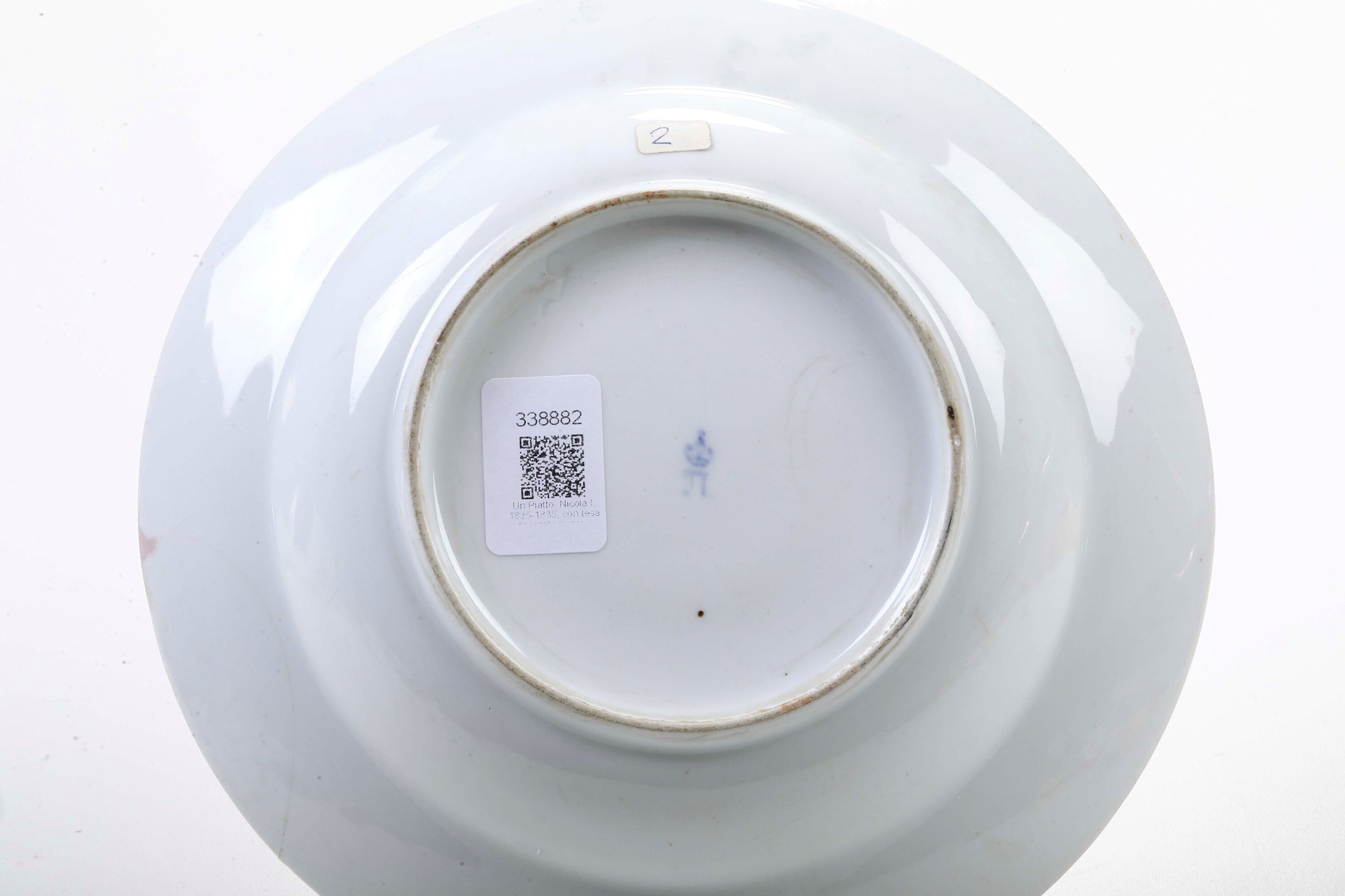 Porcellana. Marca: monogramma in cirillico con corona in blu. Diametro cm 23,6. Conservazione: rotture sulla tesa tra le ore 4 e le ore 5 e alle ore 7; qualche usura all’oro