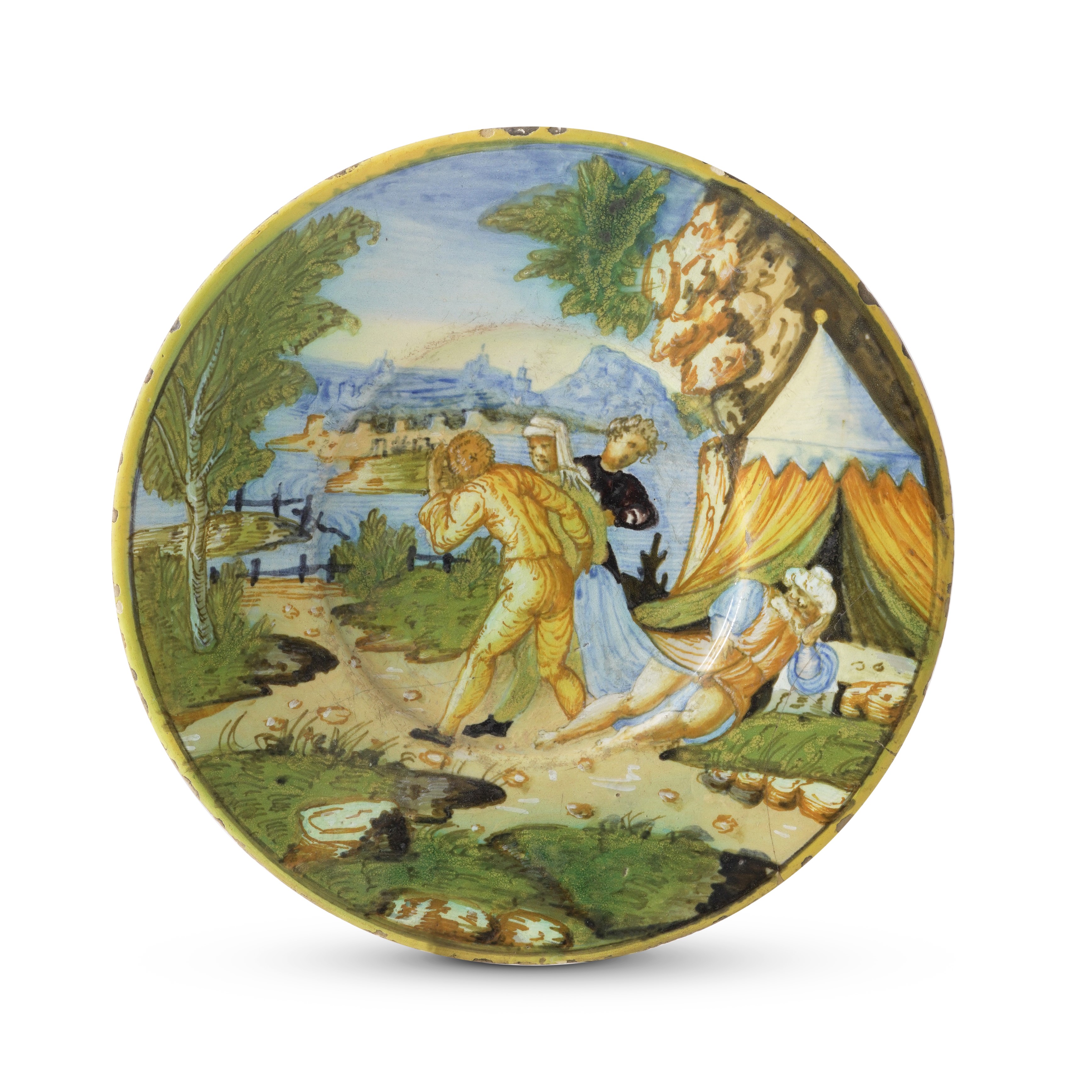 Piatto istoriato ascrivibile all’ambito urbinate, intorno agli anni ’70 del Cinquecento, la cui esecuzione manifesta l’elevato standard qualitativo delle opere uscite soprattutto dalla bottega dei Fontana. La composizione con quelle della nota bottega urbinate condivide l’equilibrio tra la parte figurativa e quella a paesaggio, la luminosa brillantezza cromatica, la definizione minuta dei volti ecc. La scena, inoltre, trascrive con minime varianti e con buona fedeltà nell’aspetto figurativo, l’omonima xilografia contenuta nella Bibbia di Francoforte, edita nel 1533 ed illustrata da Hans Sebald Beham (Fig. b). J. Lessmann cita la stessa fonte per una coppa di Faenza, attribuibile alla bottega di Virgiliotto Calamelli, e ricorda un vaso della bottega dei suddetti Fontana del corredo della Farmacia della Santa casa nel palazzo Apostolico di Loreto, e due coppe urbinati del Museo di Stoccarda (1)