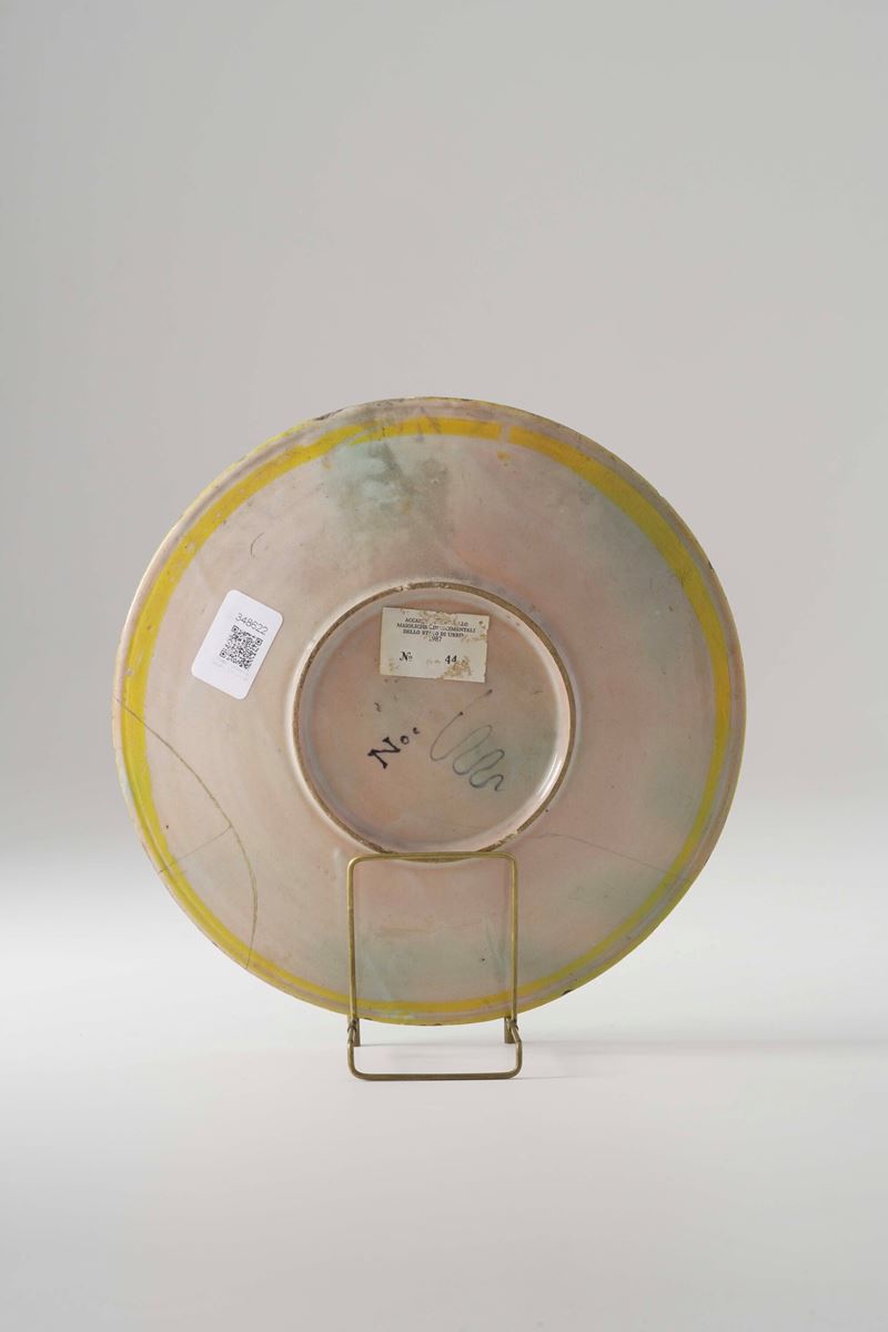 Maiolica. Diametro cm 25,5. Conservazione: rottura, composta da due frammenti, incollata tra le ore 3 e ore 5; felatura che parte dalle ore 8 e termina nel cavetto; piccole sbeccature al bordo