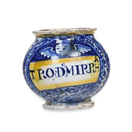 Pilloliere di “TRO.D.MIRRHA”, come si legge nella fascia centrale, cioè della gomma, ricavata dal tronco dell’albero di mirra, di provenienza orientale o africana, di ben nota proprietà antisettica. La decorazione con la figura di cherubino risparmiata sul fondo blu e la cornice a rapide virgole, la fa considerare prodotto della metà del Cinquecento nei vicini centri appenninici di Gubbio o Casteldurante