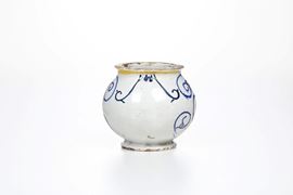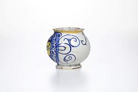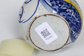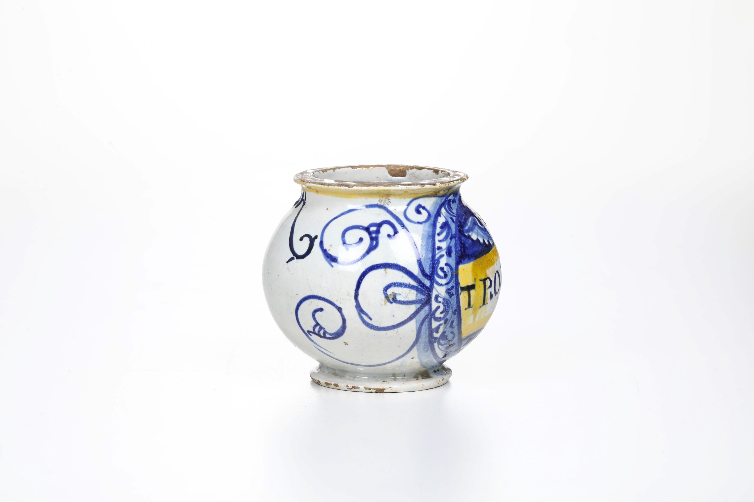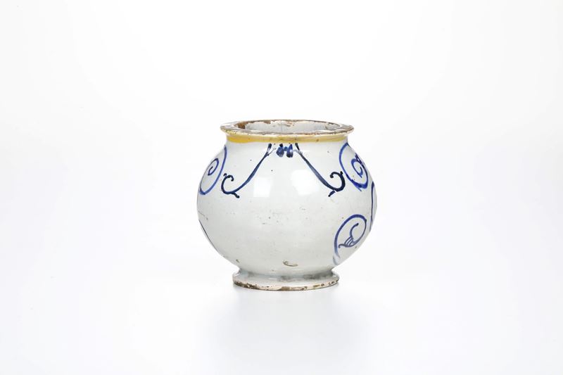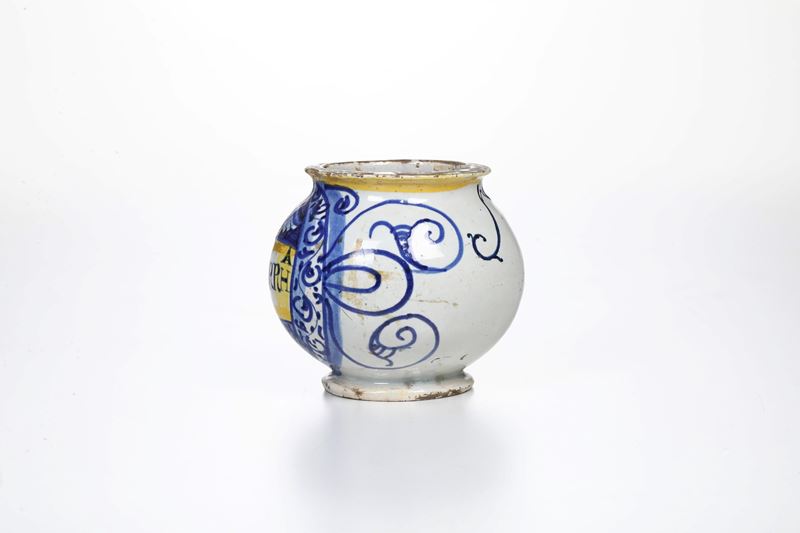 Maiolica. Altezza cm 11. Conservazione: restauro ad una felatura con cadute di smalto, che parte dal bordo superiore e scende verso il cartiglio; qualche sbeccatura