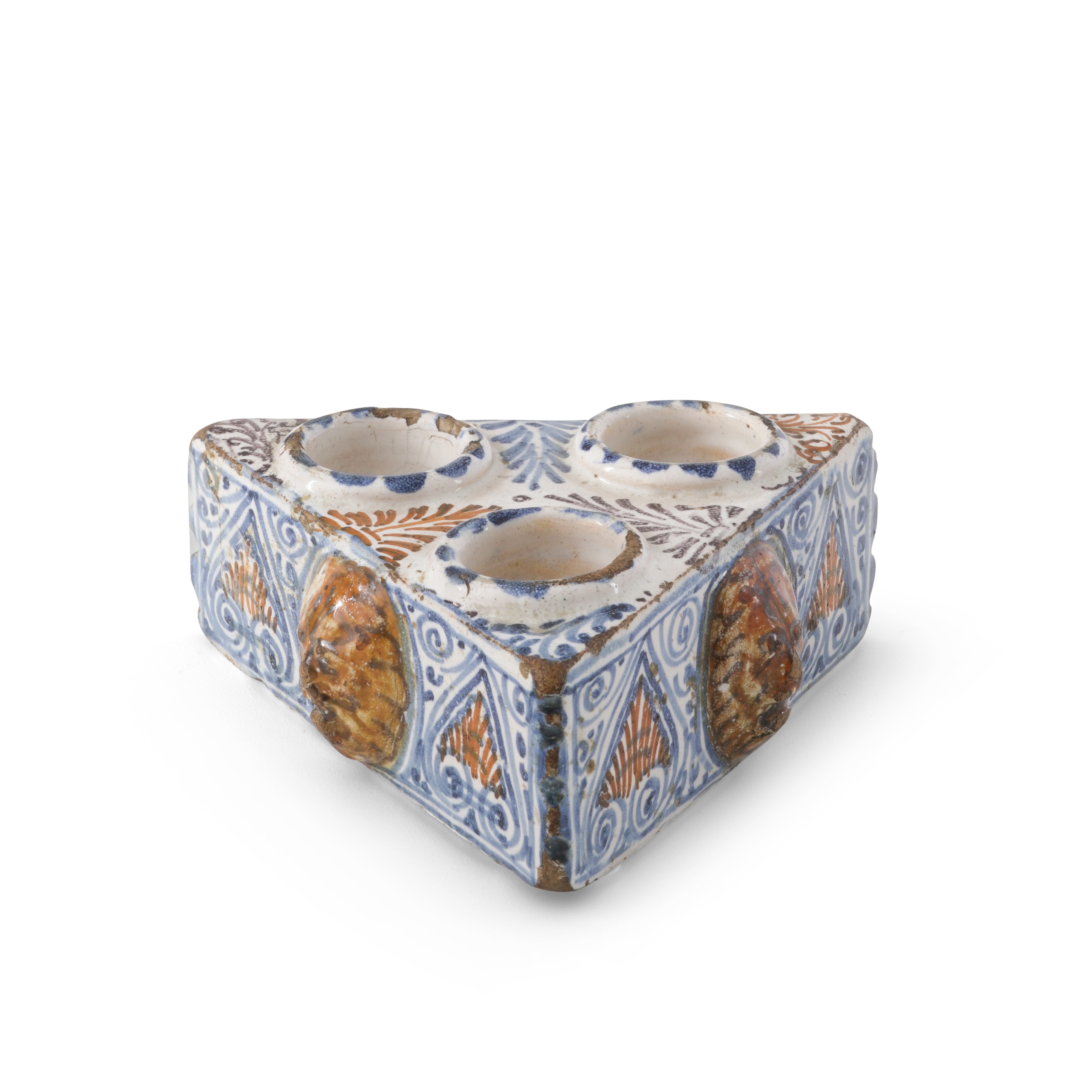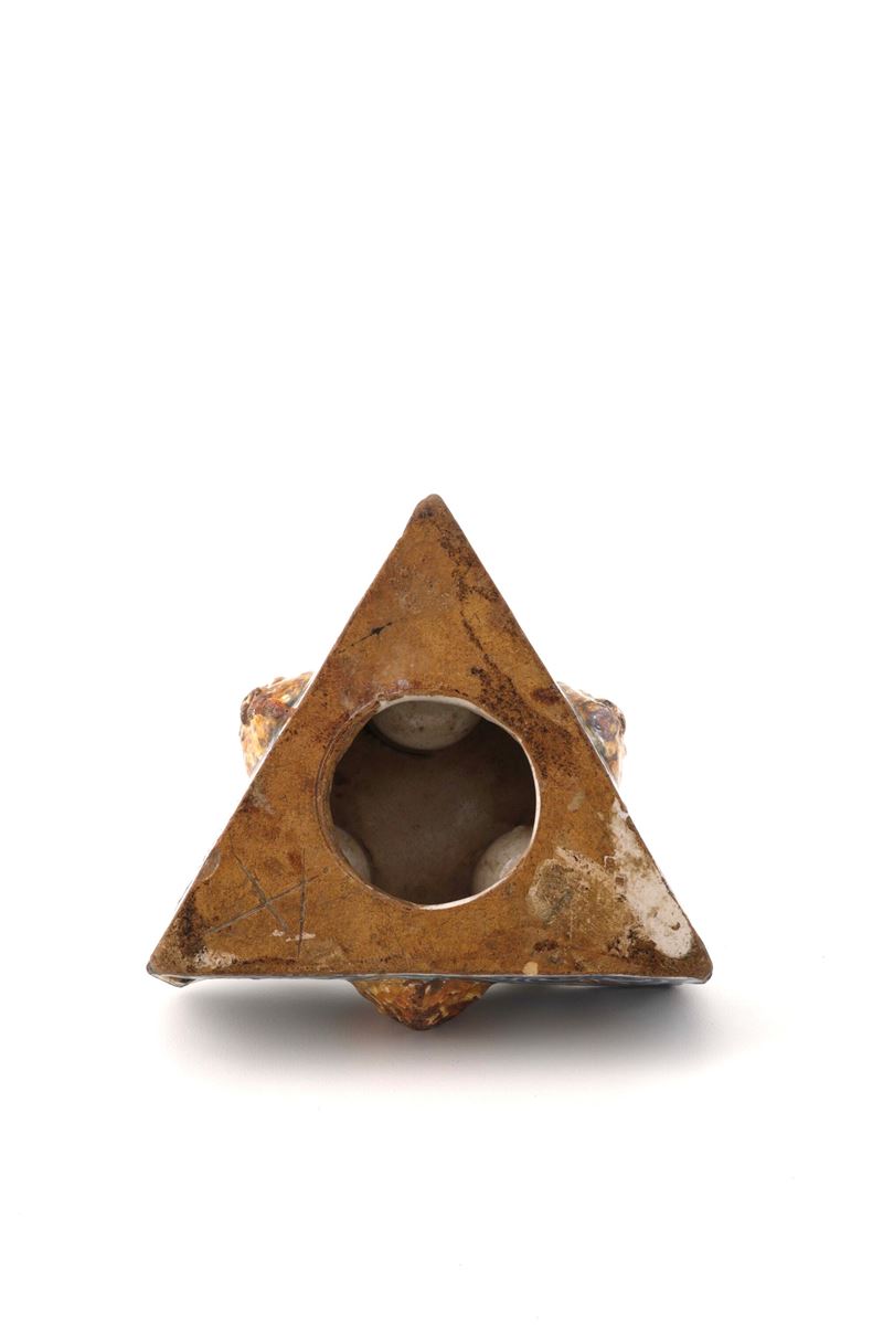 Di forma triangolare, presenta sulla faccia superiore tre piccole vaschette semicircolari e sulle pareti laterali delle teste leonine in rilievo. Eseguito in maiolica, è decorato a gran fuoco in blu, ocra e manganese