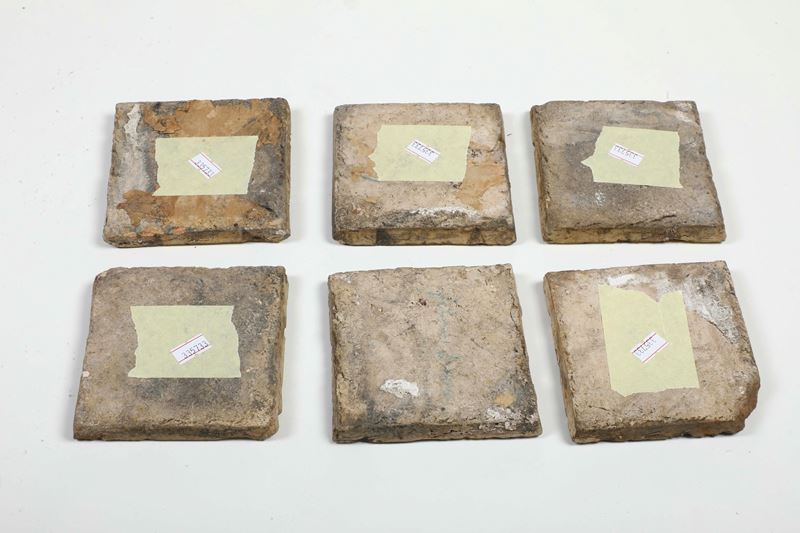 Terracotta smaltata e policroma. Dimensioni: spessore cm 1,3; cm 11,6x11,6. Conservazione: qualche sbeccatura e cadute di smalto ai bordi