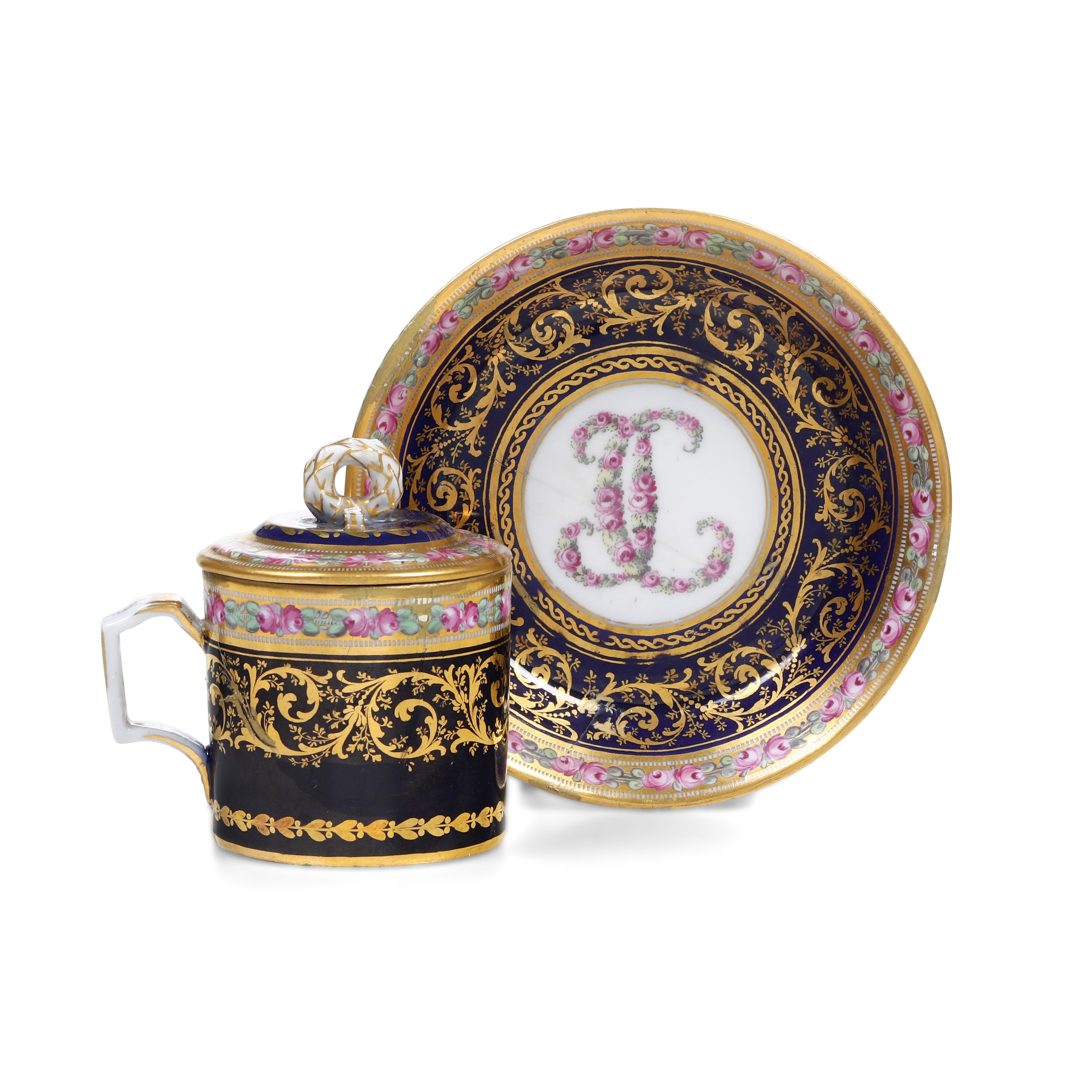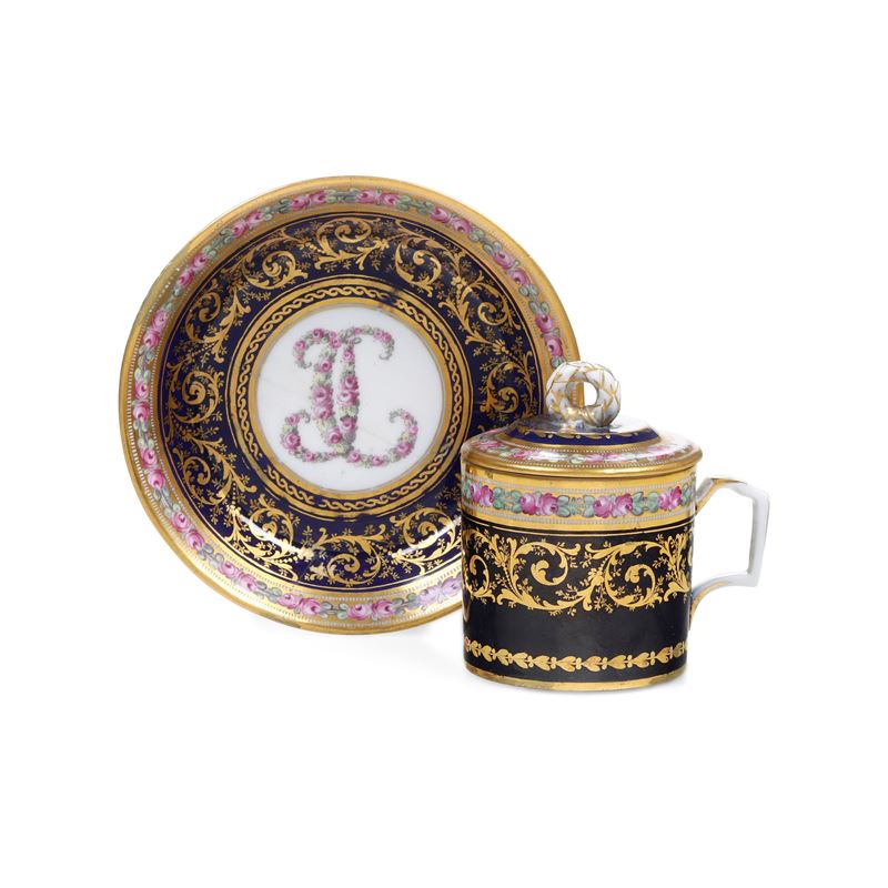 La tazza e il piattino sono decorati con due ampie fasce: una in blu di cobalto percorsa da una ricca ghirlanda rocaille dorata, e l’altra su fondo oro, con un motivo di roselline policrome, tracciate con tecnica miniaturistica. Al centro del piattino, monogramma cirillico eseguito a roselline