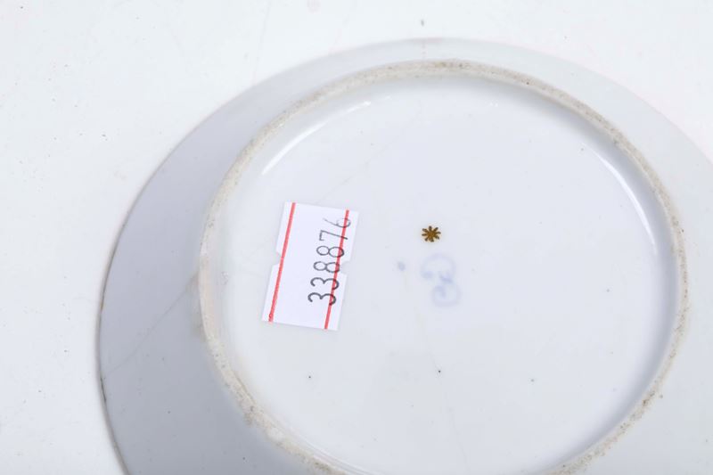 Porcellana. Marca: “E .” in blu e stellina in oro sotto al piattino. Dimensioni: altezza totale tazza cm 7; diametro piattino cm 11. Conservazione: tazza e piattino in più frammenti e ricomposti in restauro
