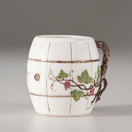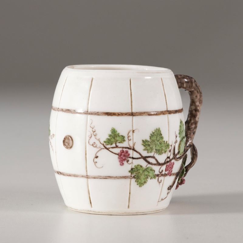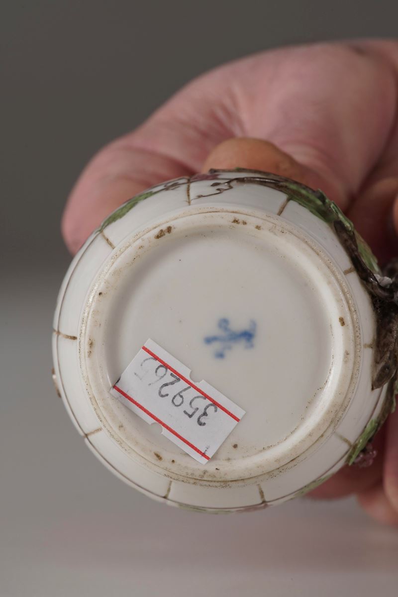 Porcellana. Marca: giglio blu. Altezza cm 7. Conservazione: manico staccato e incollato; due insignificanti mancanze alle foglie della vite