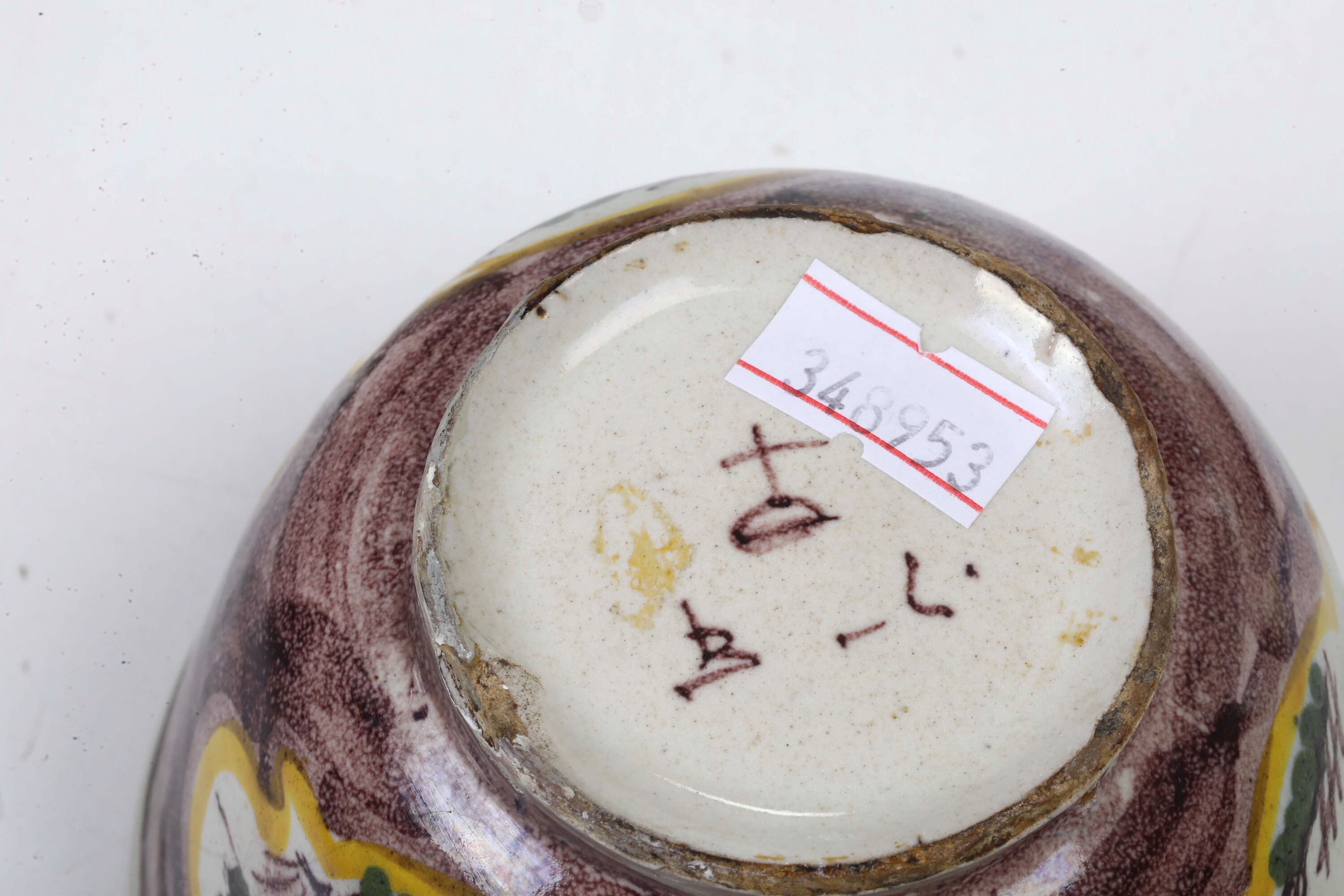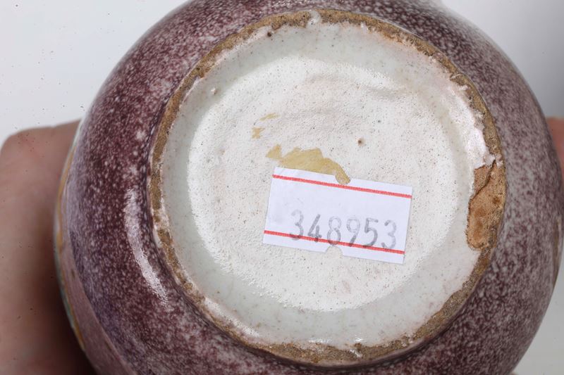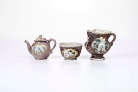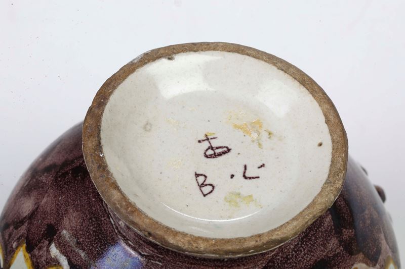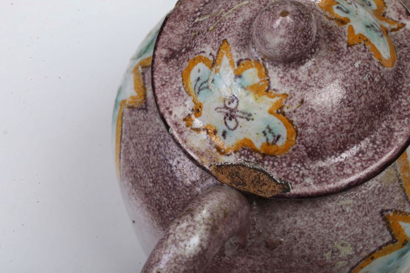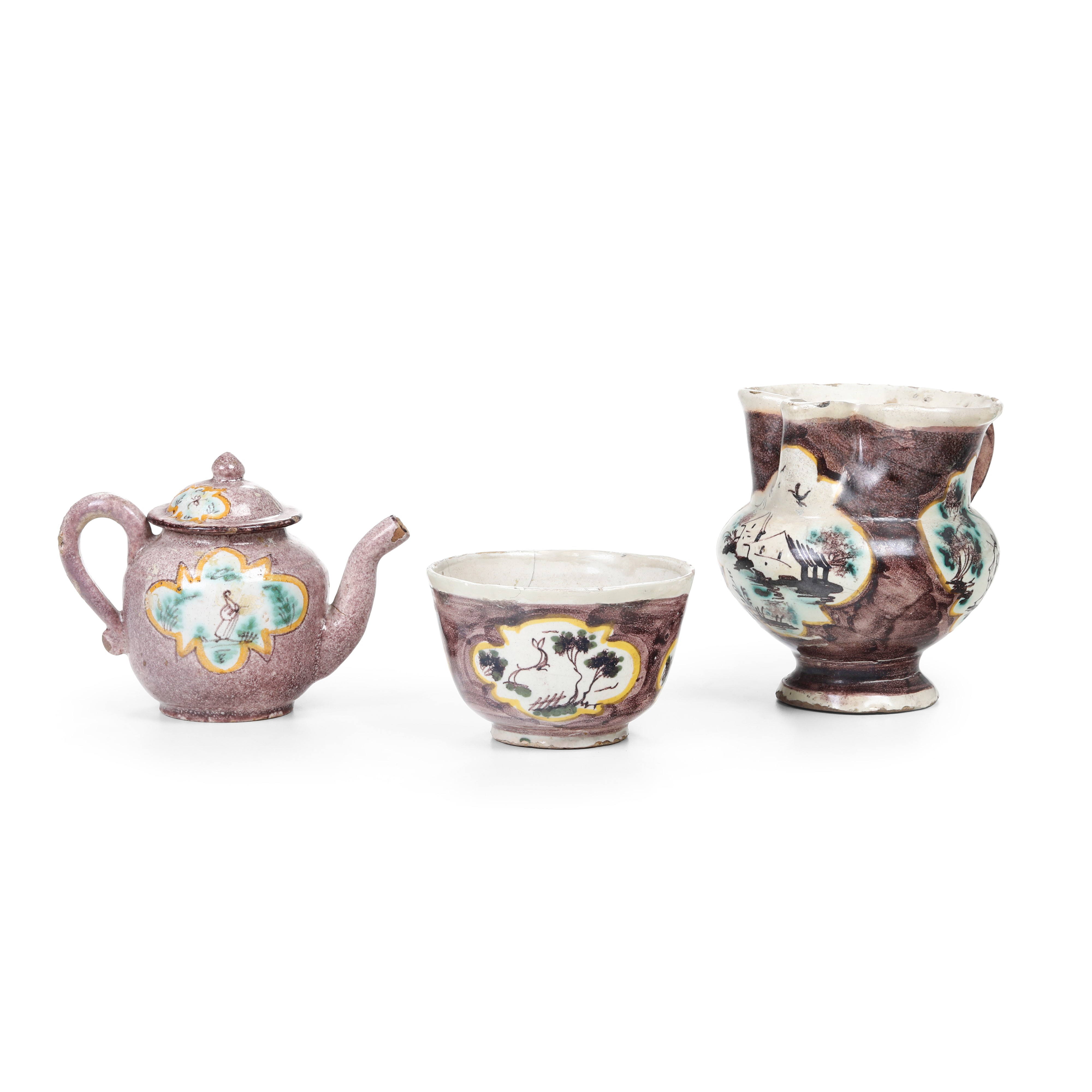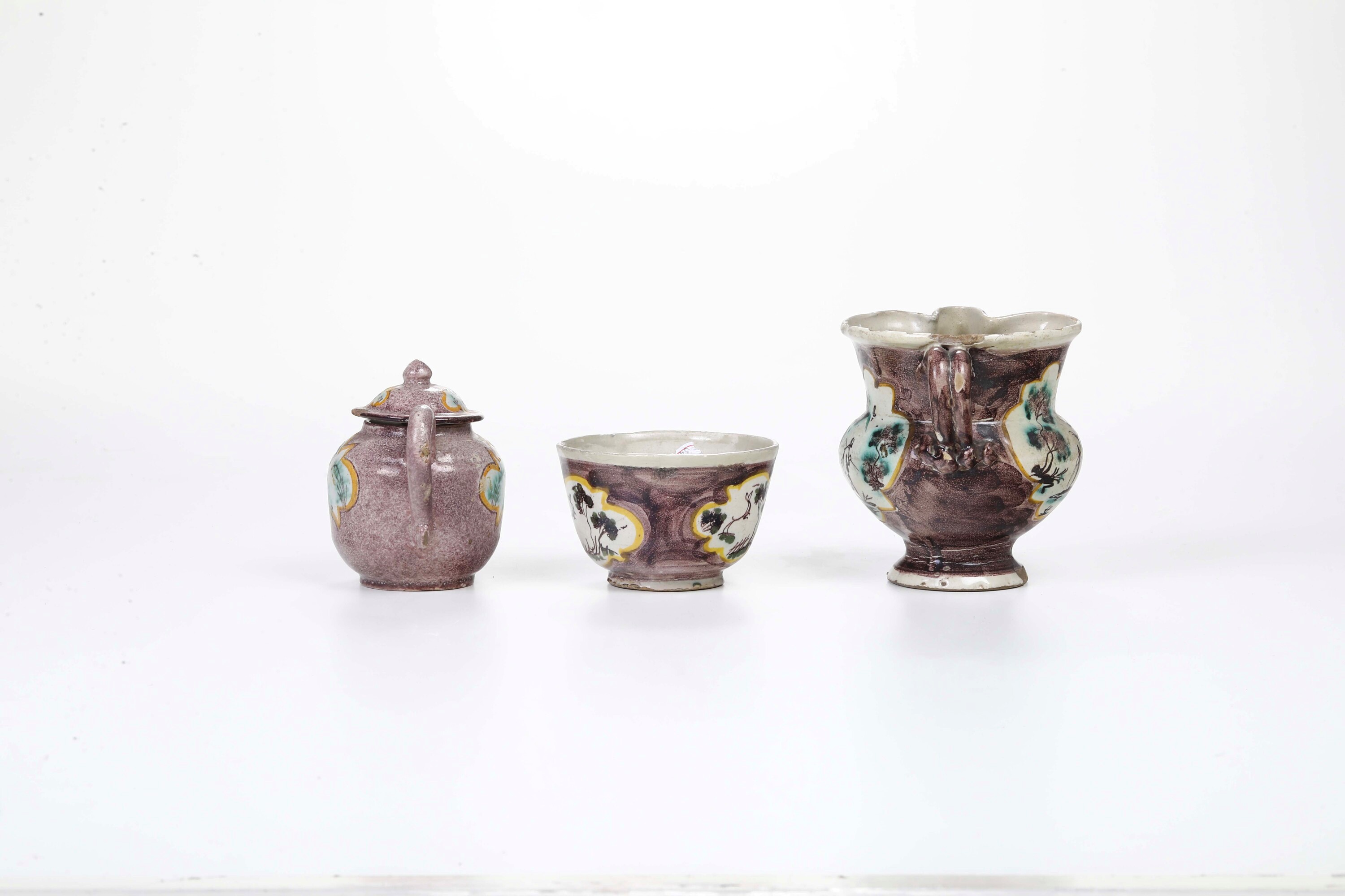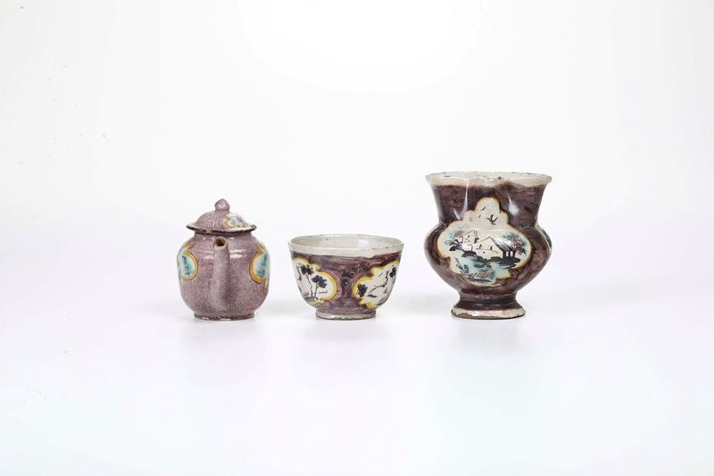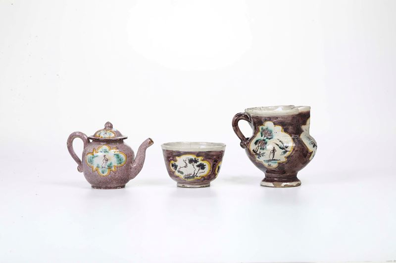 Maiolica. Marca: globo crocifero e “AB-L.” in manganese. Dimensioni: teiera altezza cm 10,4; brocca altezza cm 12,5; ciotola altezza cm 6,6 e diametro cm 10,4. Conservazione: teiera con beccuccio incollato e sbeccatura al bordo del coperchio; parte del collo e del beccuccio staccati e ricomposti in restauro, qualche salto di smalto ai bordi; ciotola con felature e integrazioni al bordo superiore