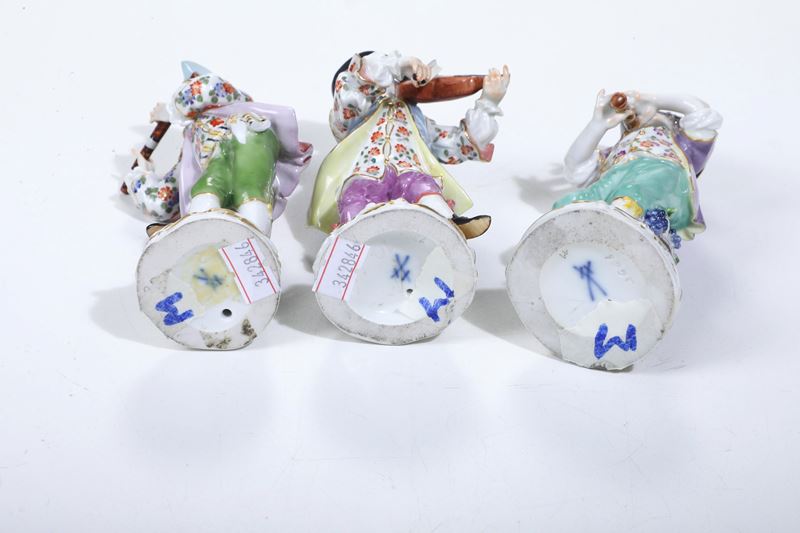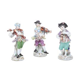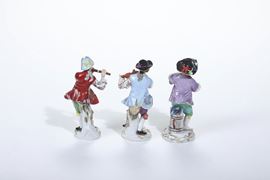 Le nostre statuine raffigurano tre giovani musicisti. Intorno al 1750, a Meissen, si cominciò a rappresentare innumerevoli suonatori e intere orchestre formate da amorini, bimbe e tanti altri personaggi, la più famosa delle quali è quella con le scimmie