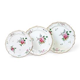 I piatti sono decorati con il motivo della "rosa" in policromia a piccolo fuoco. La superficie ospita un grande bouquet e tralci di rametti fioriti o fogliati, il bordo mosso è orlato da una sottile linea color cannella