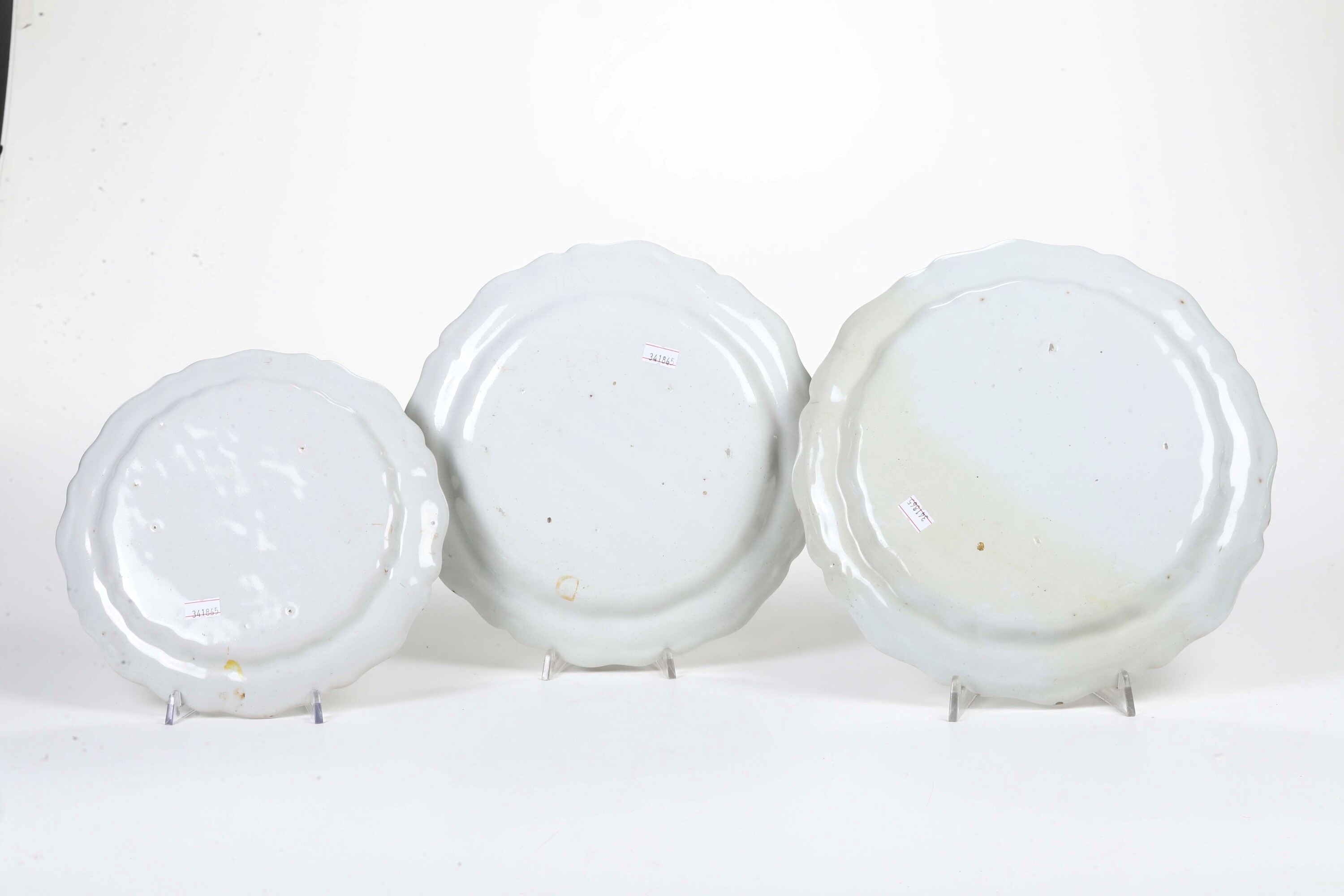 Maiolica. Marca: assente. Diametro cm 29,5; cm 26,5; cm 24. Conservazione: qualche sbeccatura ai bordi; piatto da 29,5 di diametro rotto in tre o più frammenti e ricomposto