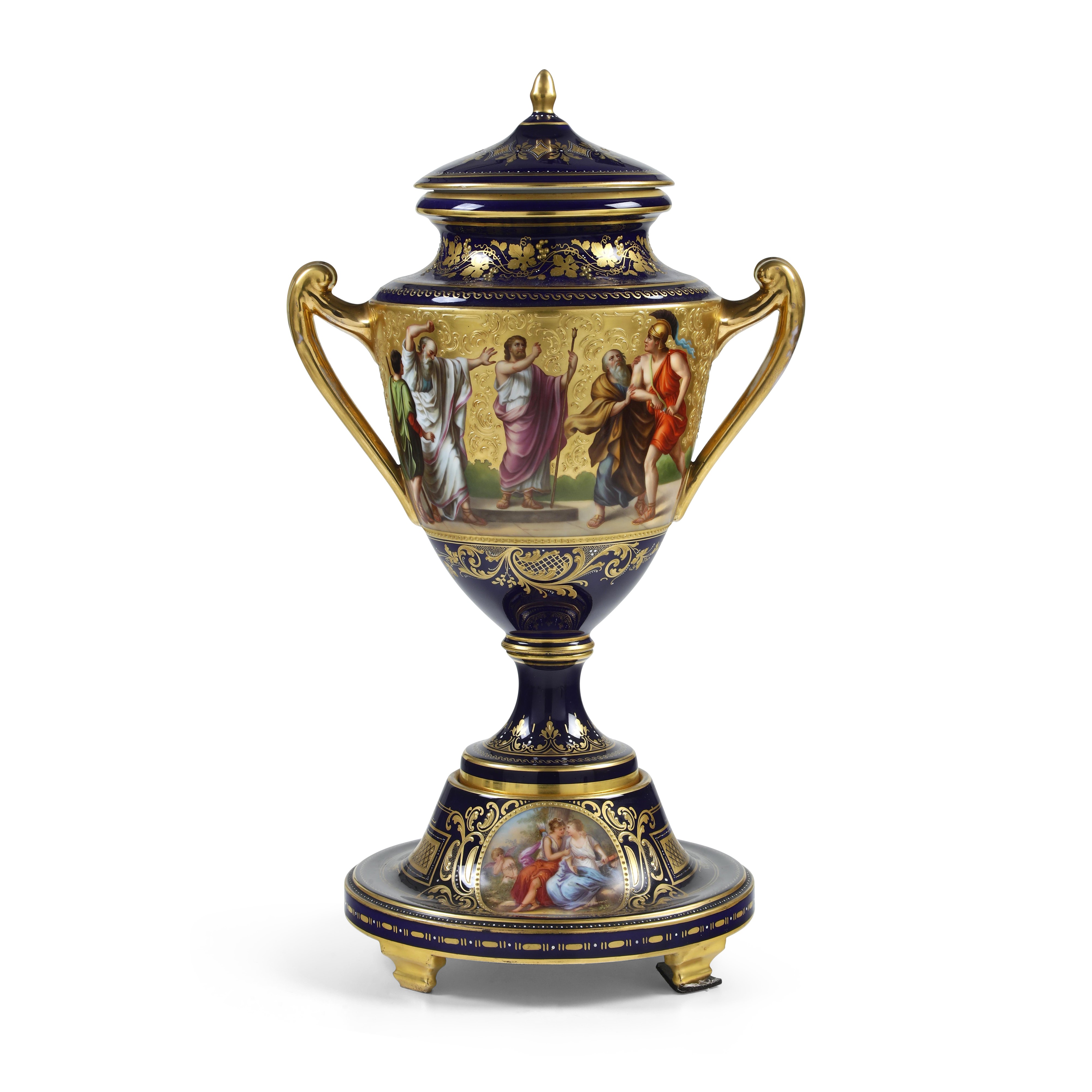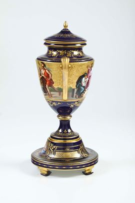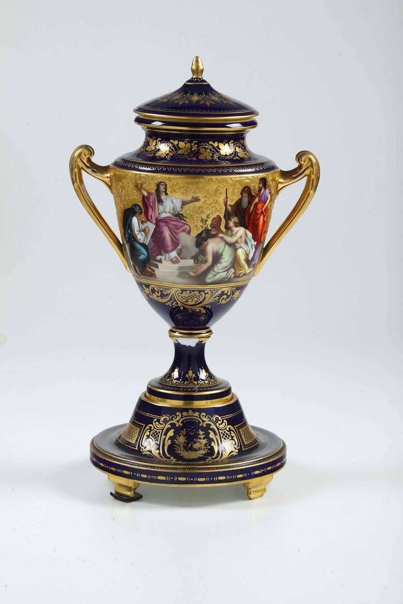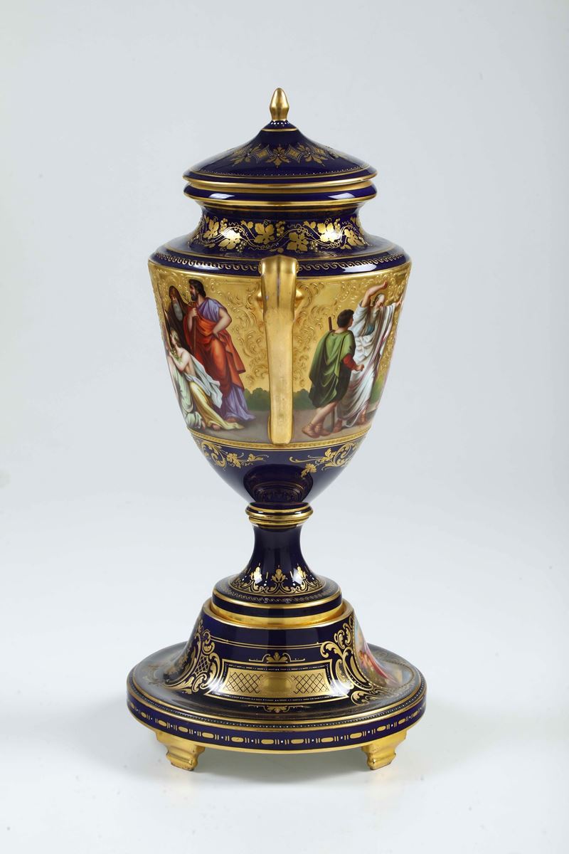 L’elegante vaso a urna biansata, con il coperchio, poggia su una base circolare con piedini. La decorazione, realizzta alla maniera di Vienna, presenta su un fondo blu cobalto, una fascia centrale con scene figurate di ispirazione classica, forse tratte dall’Antico Testamento, che si stagliano su un fondo dorato, firmate F. Koller. La base ospita una scena con Diana