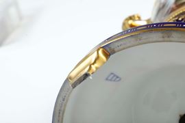 Porcellana. Marca: pseudo scudo di Vienna in blu. Altezza cm 53. Conservazione: rottura all'anello d'attacco tra la base e il corpo del vaso; coperchio restaurato; qualche usura all'oro dei manici