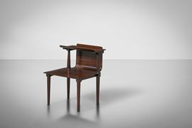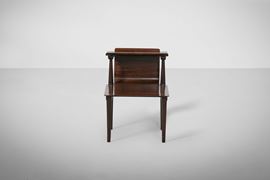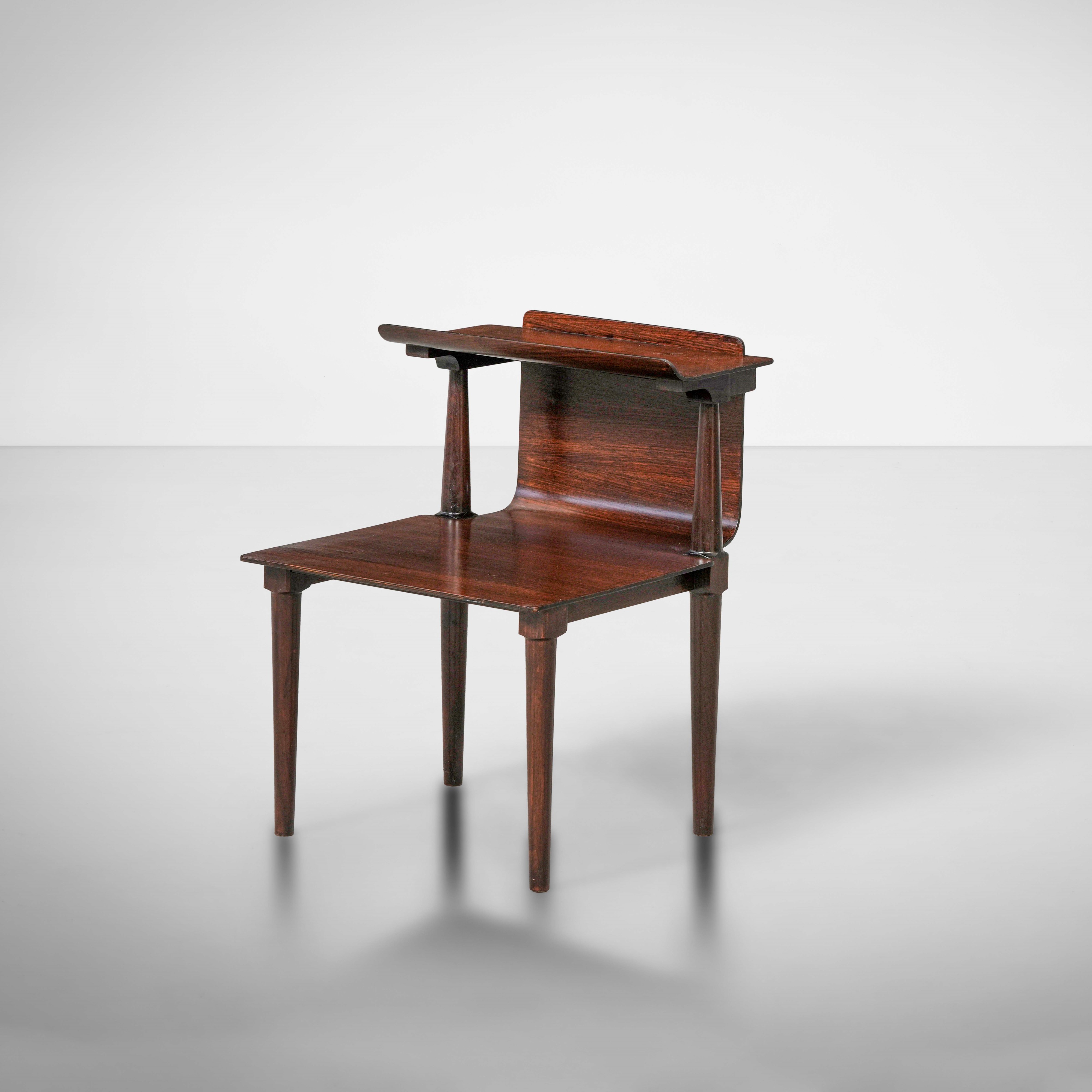 Struttura in legno tinto con piani in legno laminato e curvato.