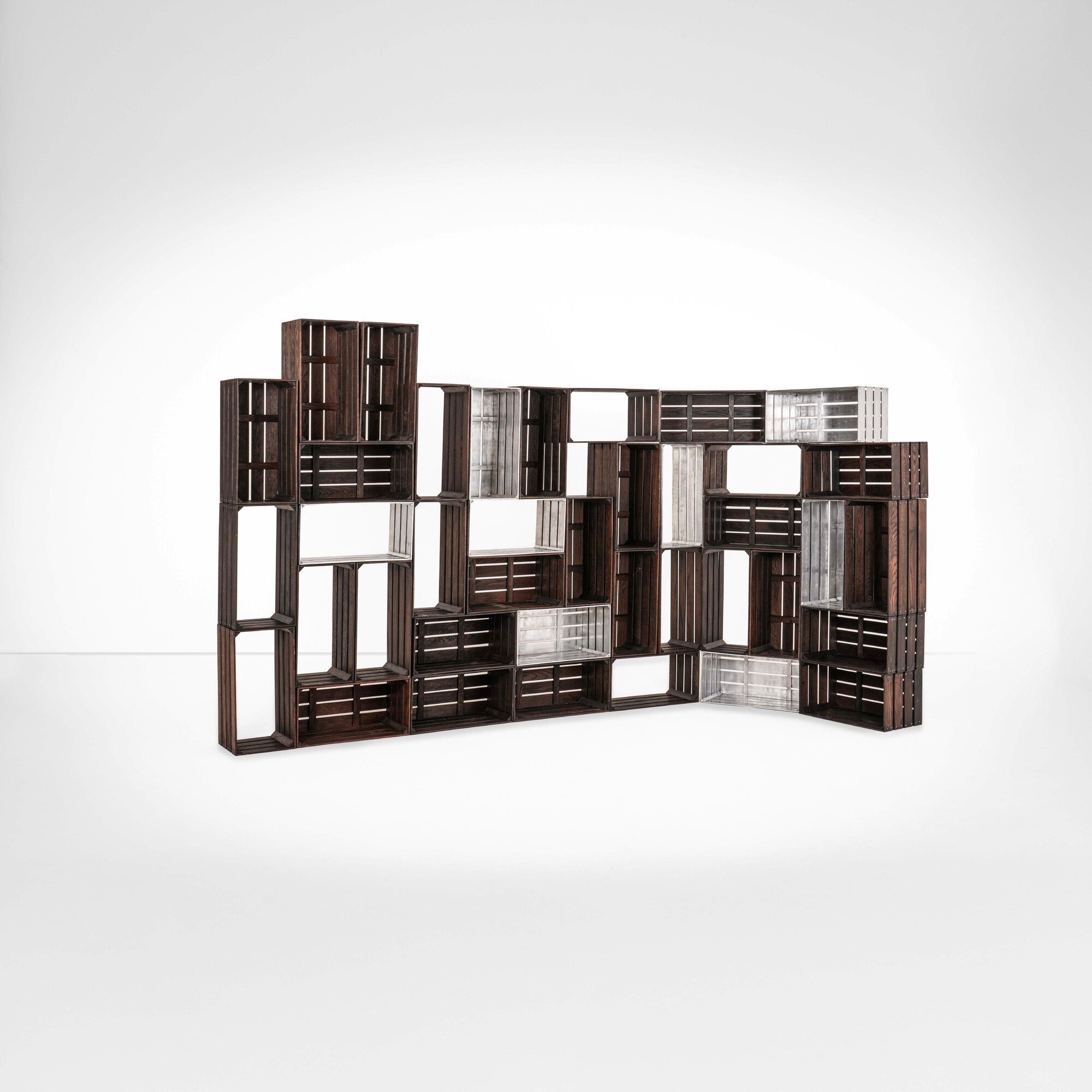 Struttura composta da trentanove moduli componibili in legno laccato e metallo argentato.