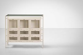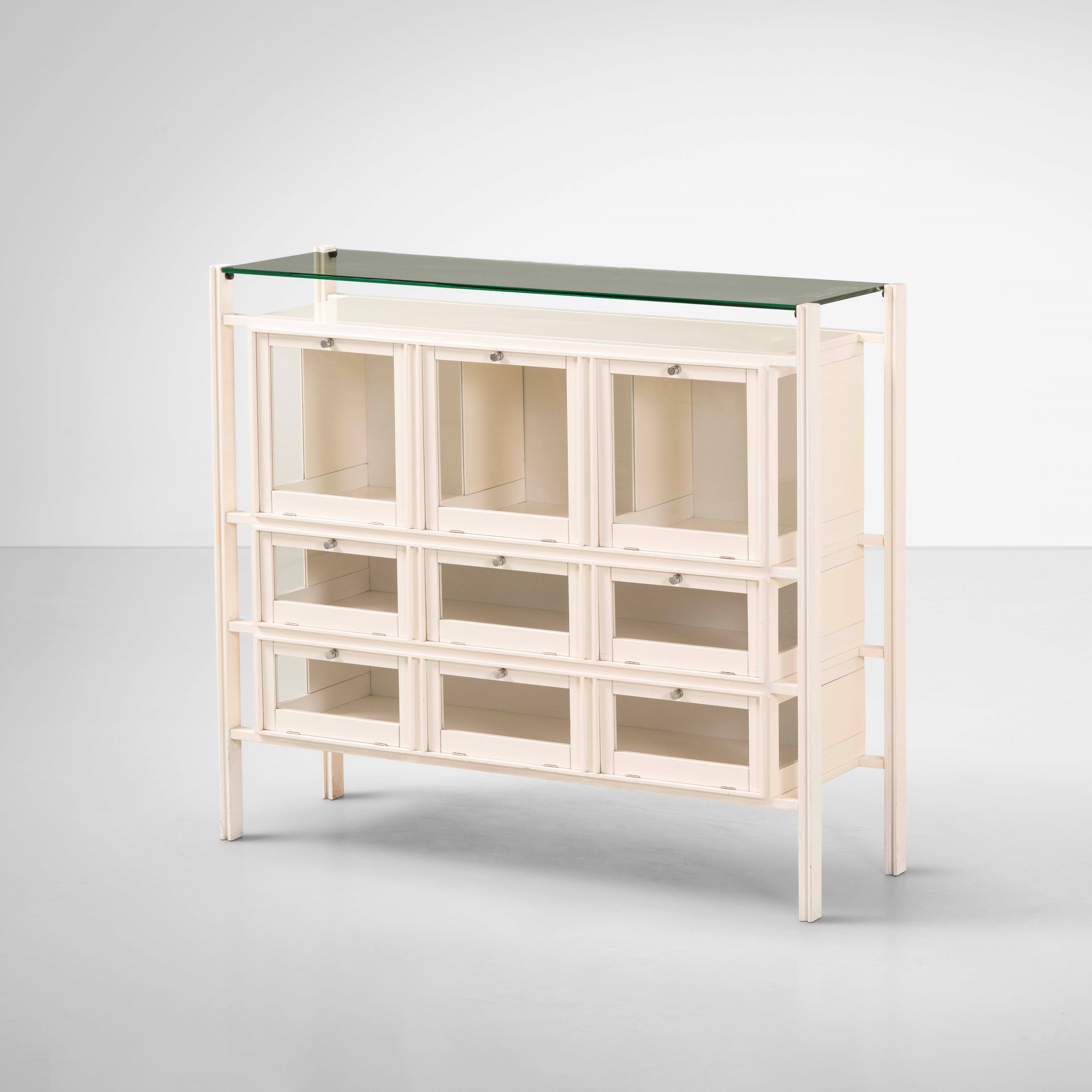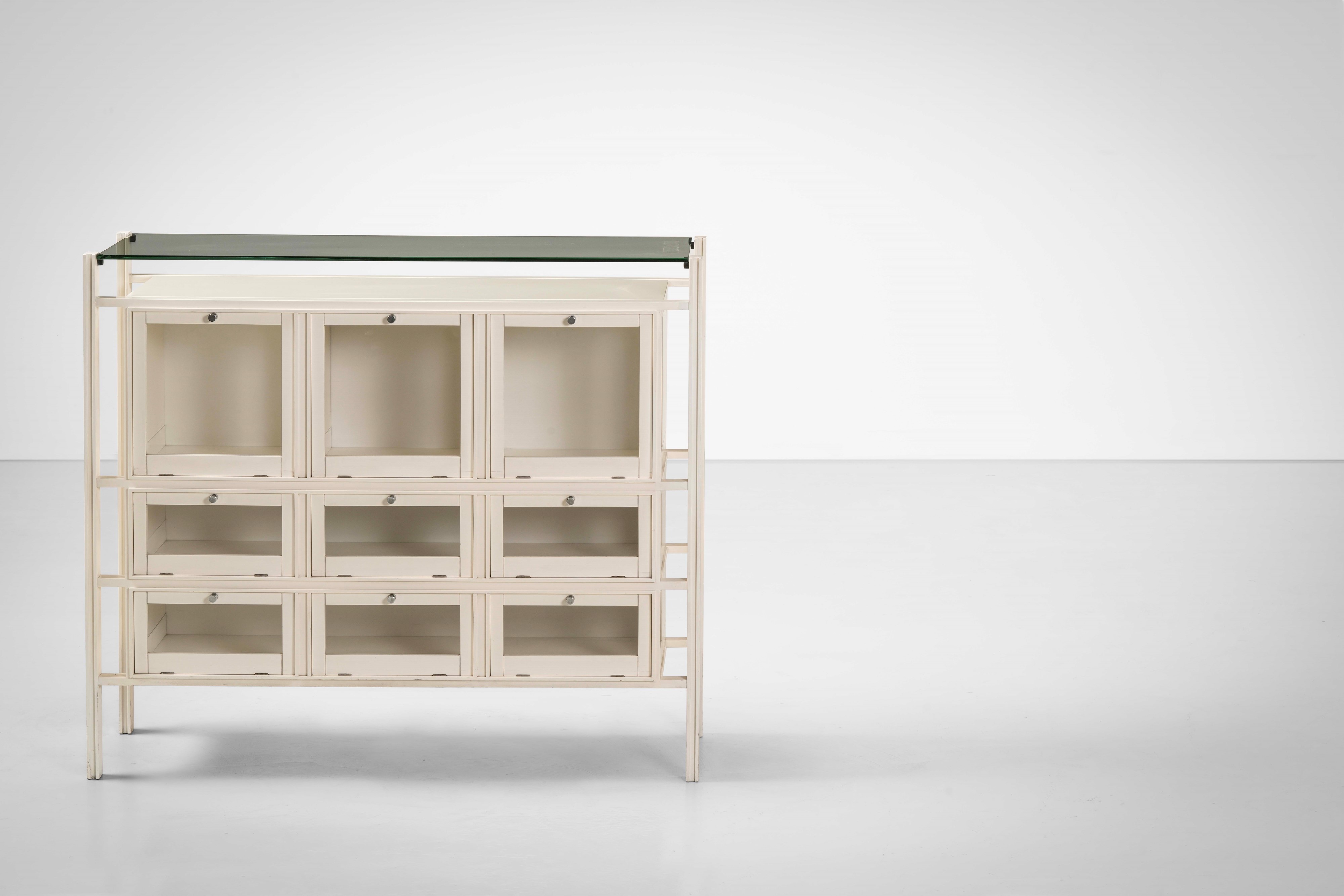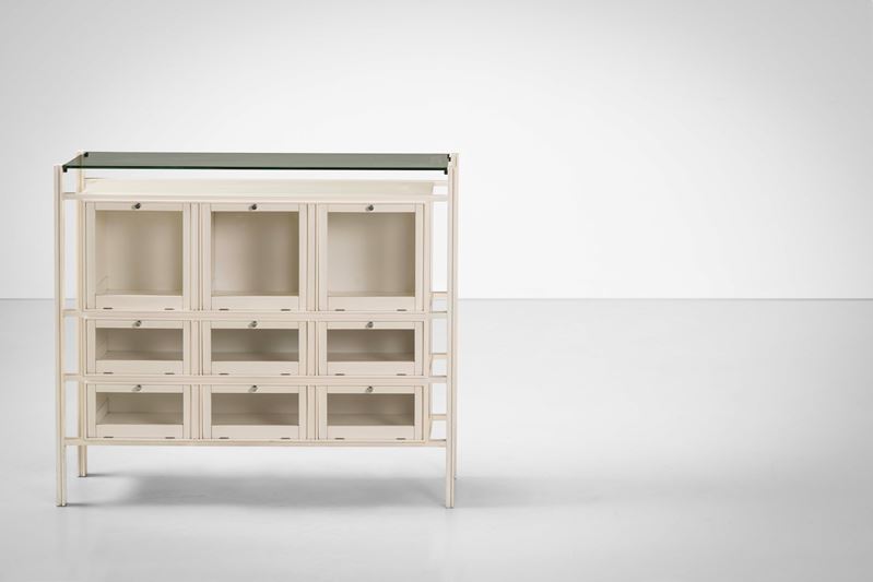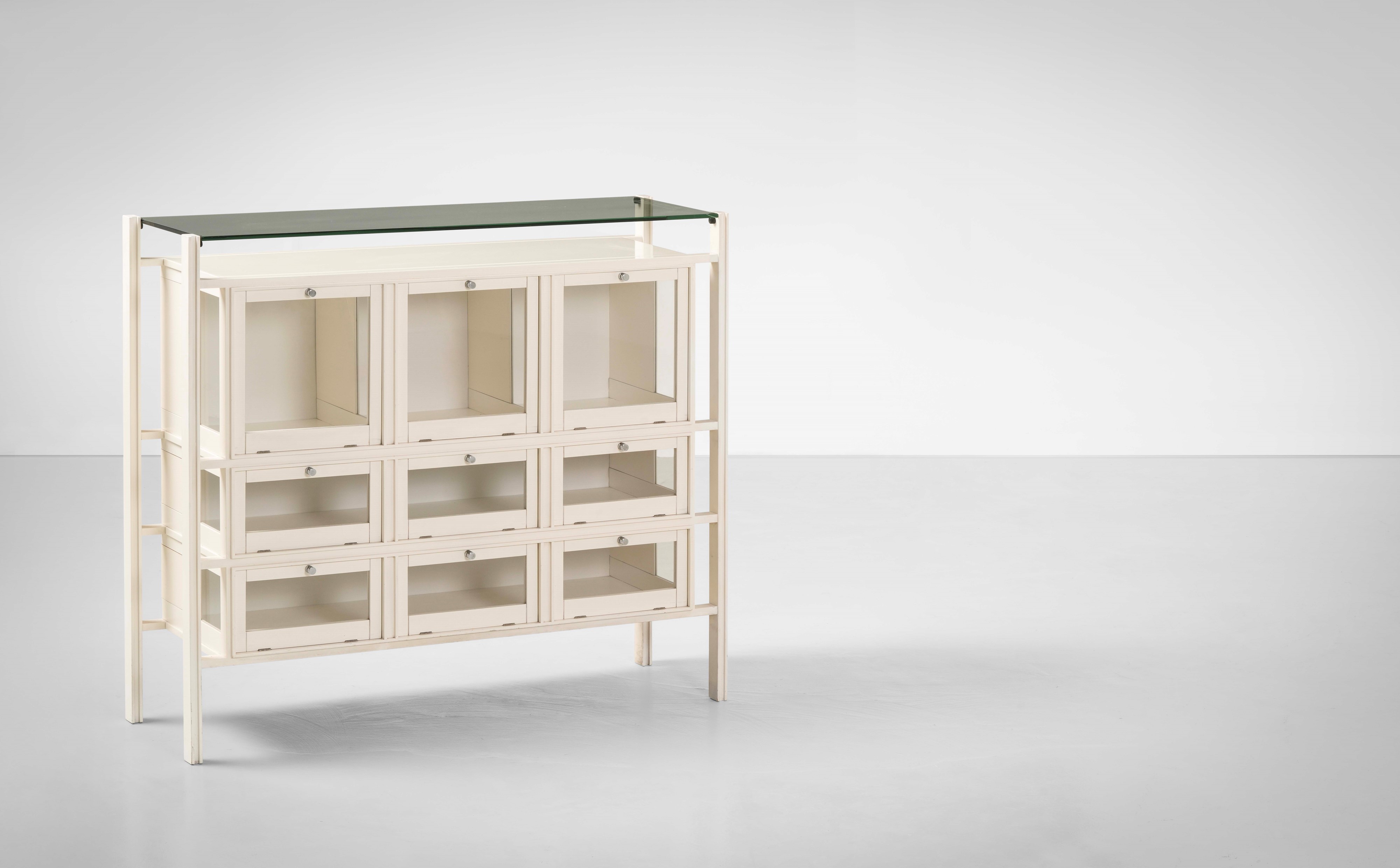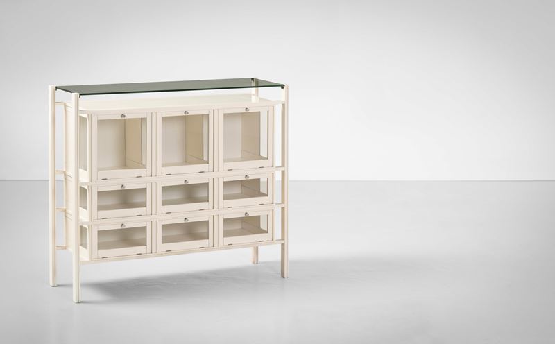 Struttura in legno laccato con ante a ribalte. Piano in cristallo molato e pomelli in metallo cromato.