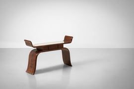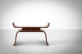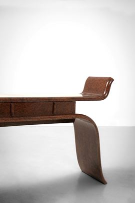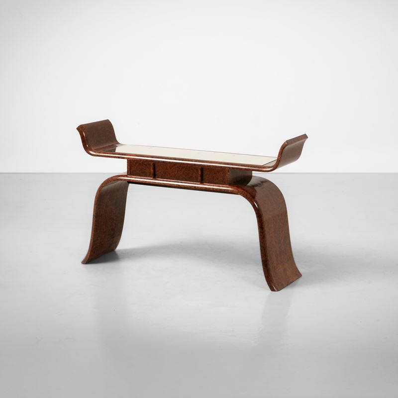 Struttura in impiallacciatura di radica con piano in cristallo specchiato.