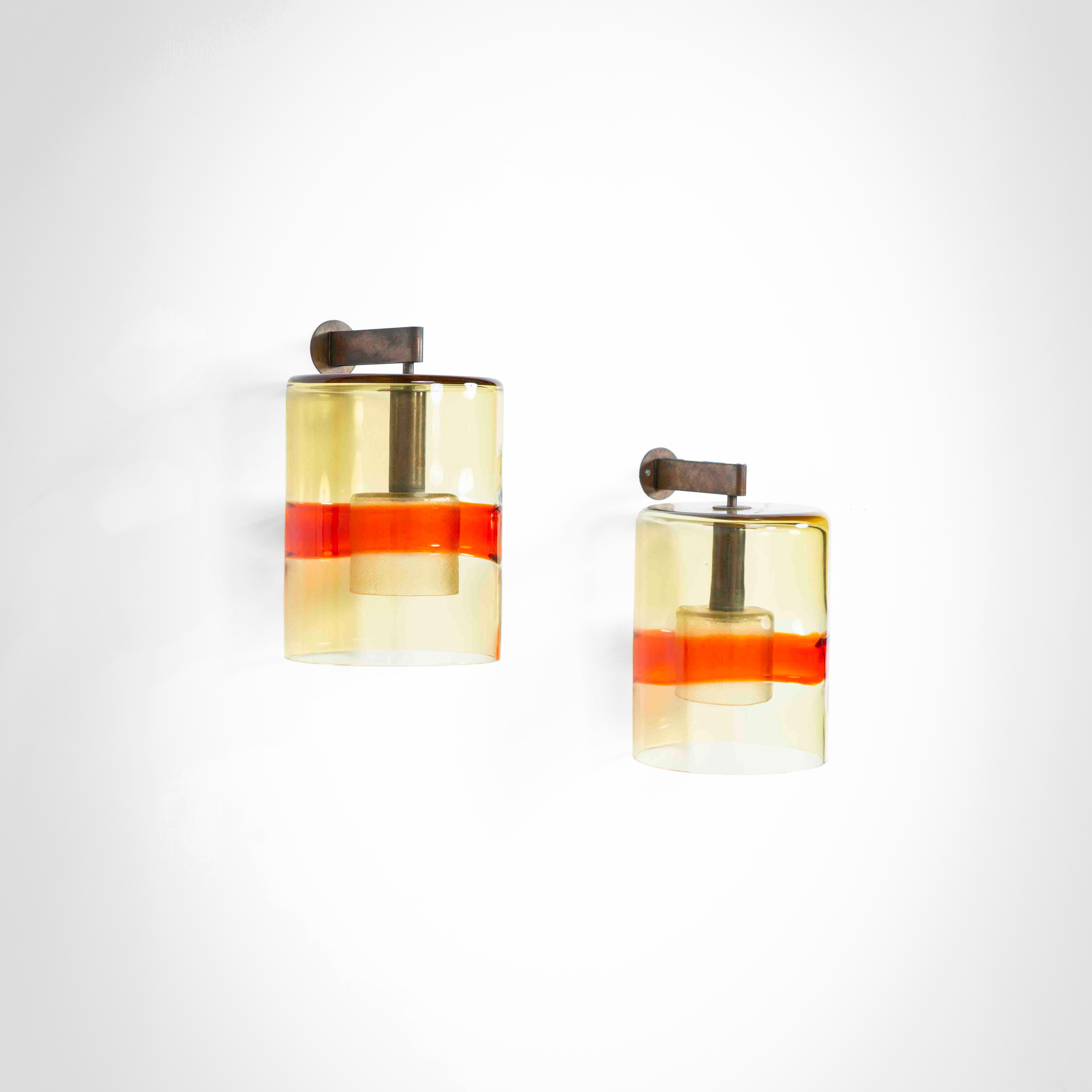 Struttura in ottone. Diffusore esterno in vetro di Murano a fasce e diffusore interno in vetro di Murano acidato.
