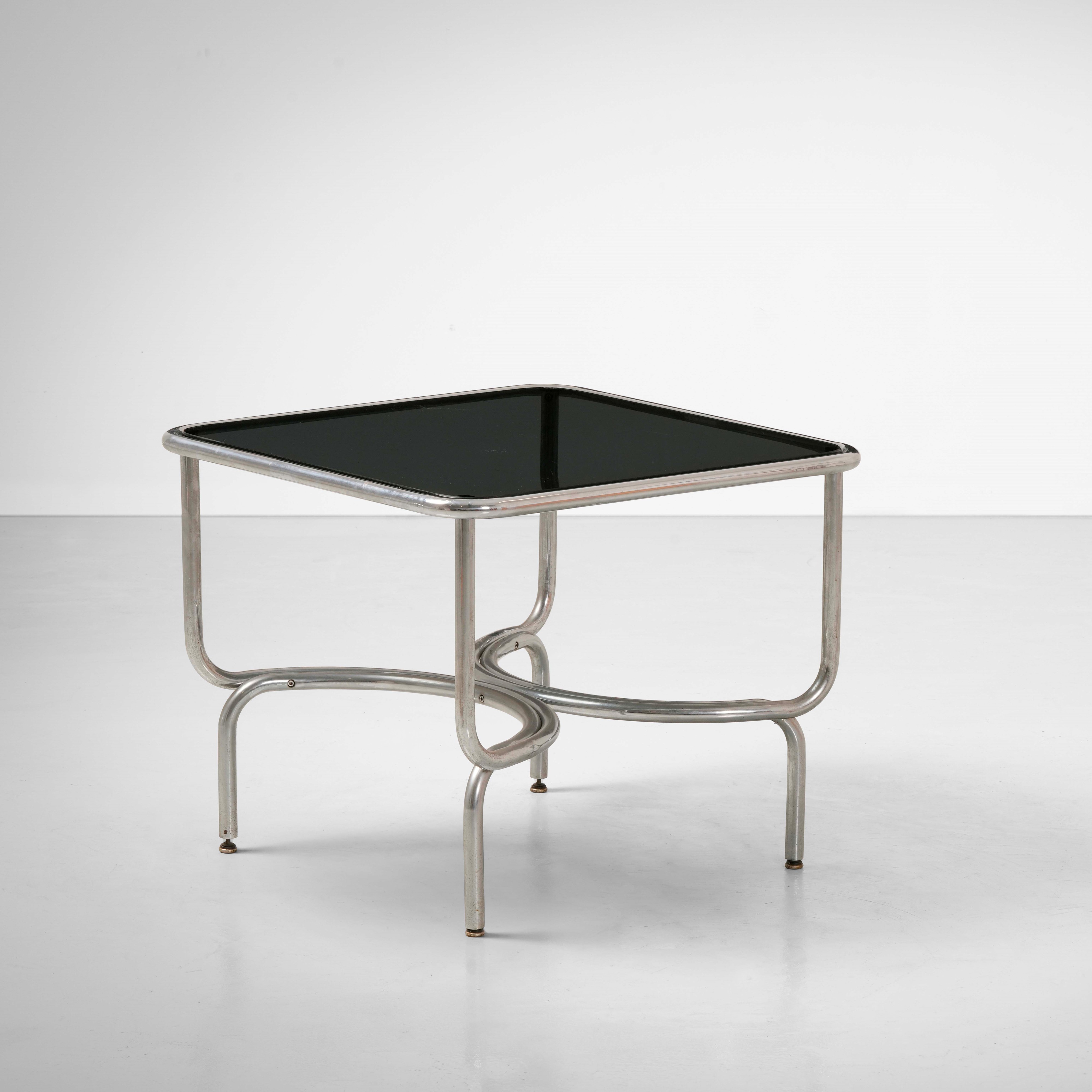 Struttura in metallo tubolare cromato e piano in cristallo molato e colorato.