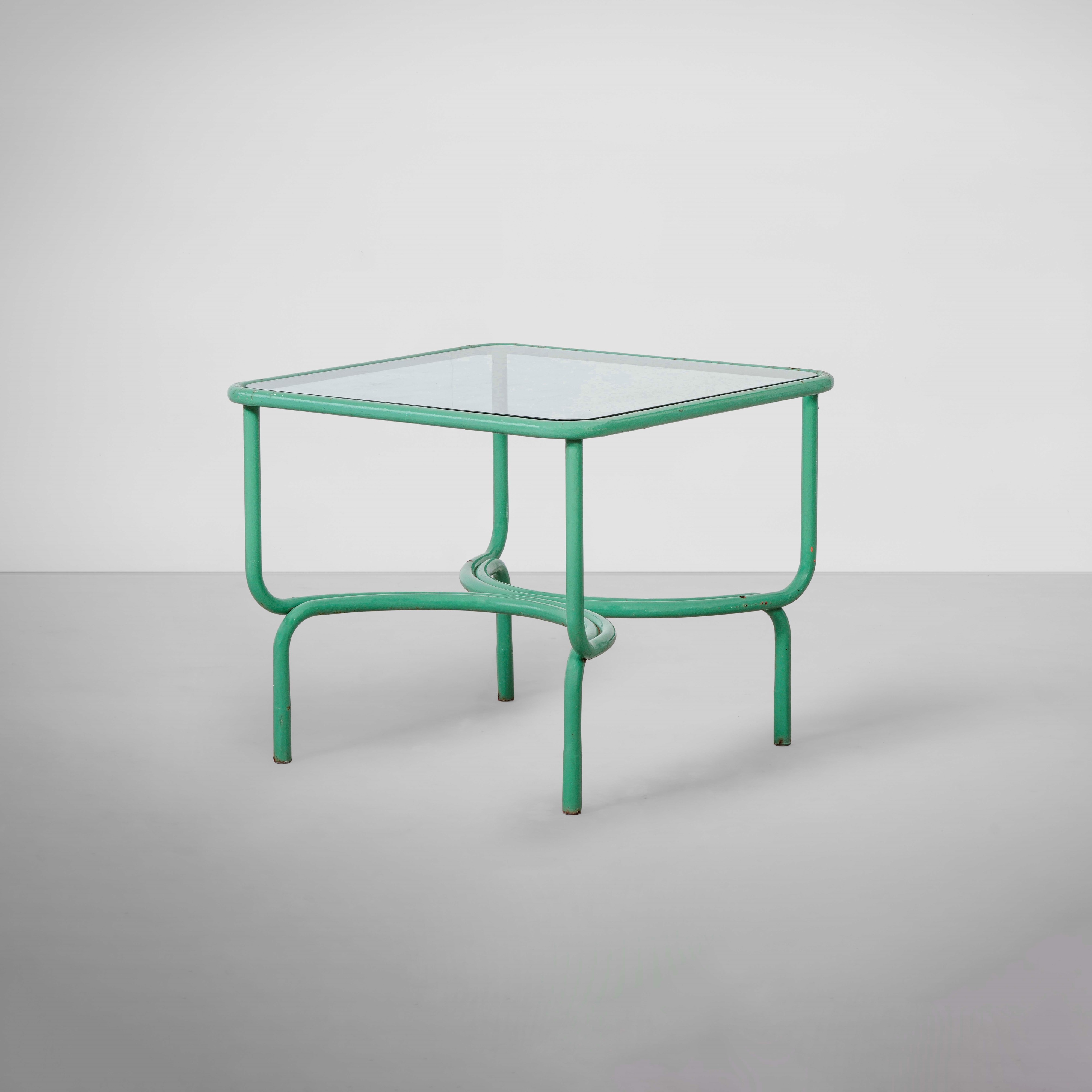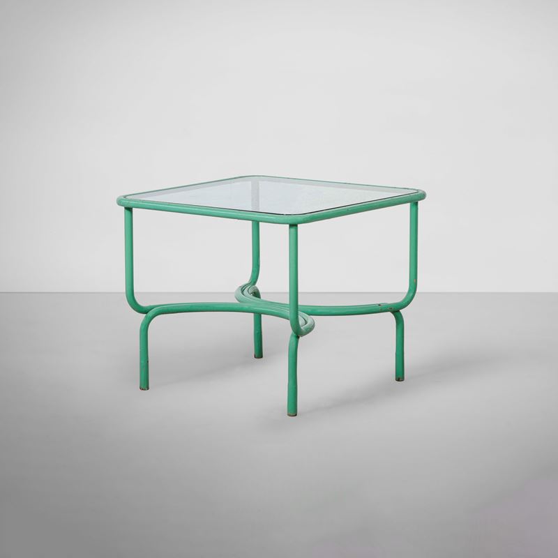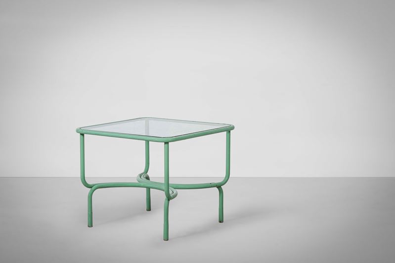 Struttura in metallo tubolare laccato. Piano in cristallo molato.