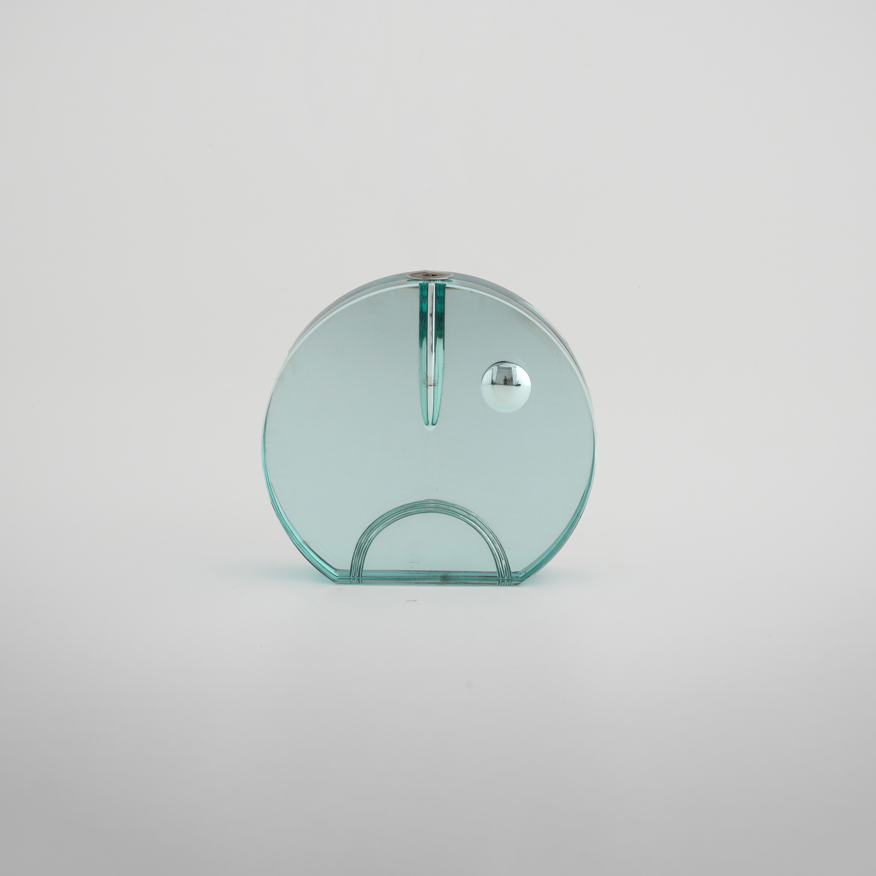 Struttura in vetro specchiato di forte spessore, particolari in metallo.