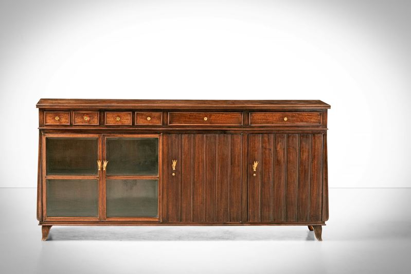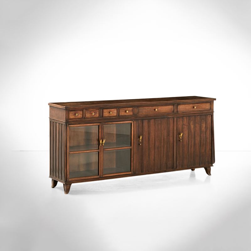 Struttura in legno impiallacciato e grissinato con ante in vetro mollato. Dettagli e pomelli in ottone.