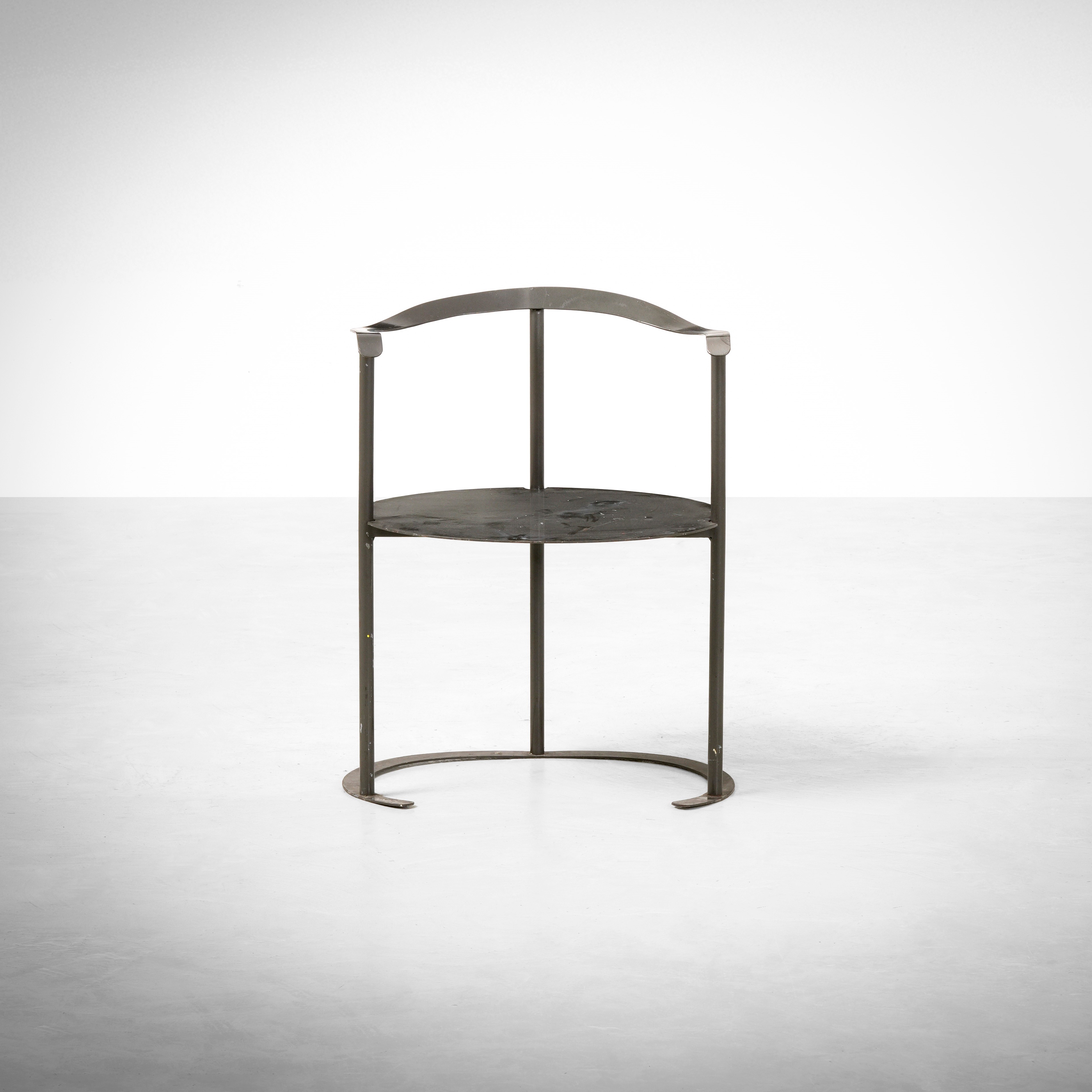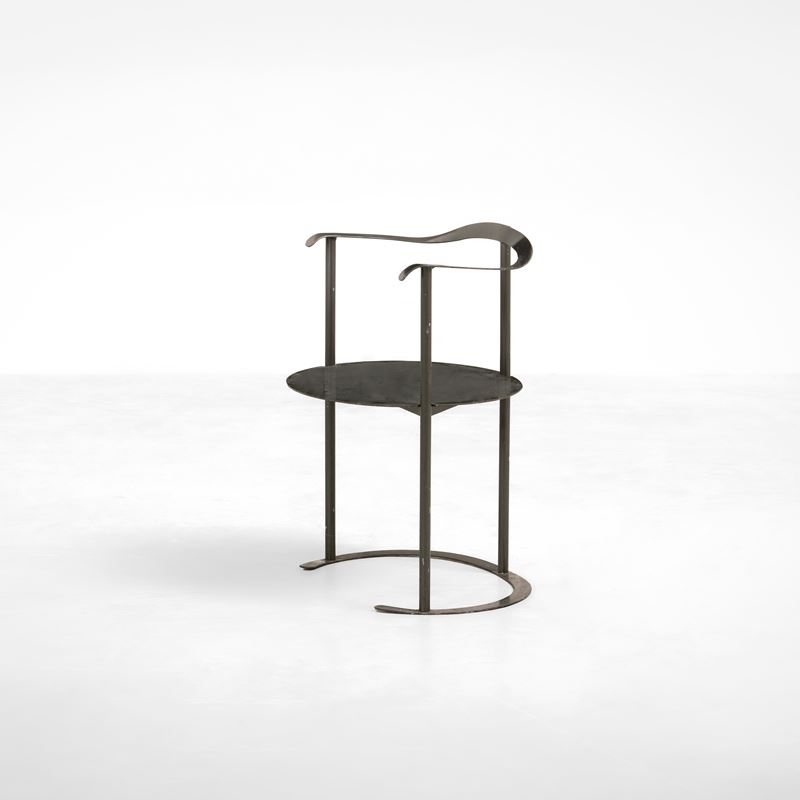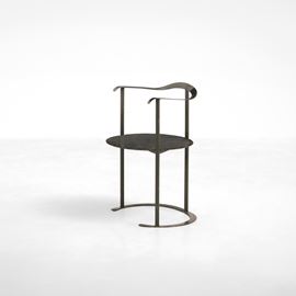 Struttura in metallo sagomato, forgiato e laccato. Seduta in legno laccato.