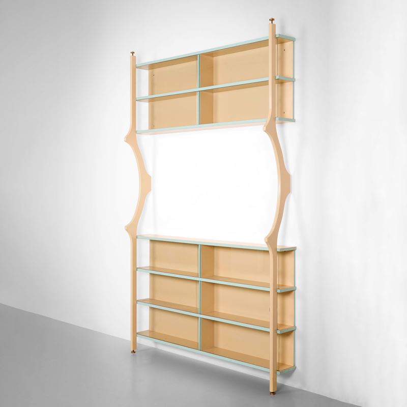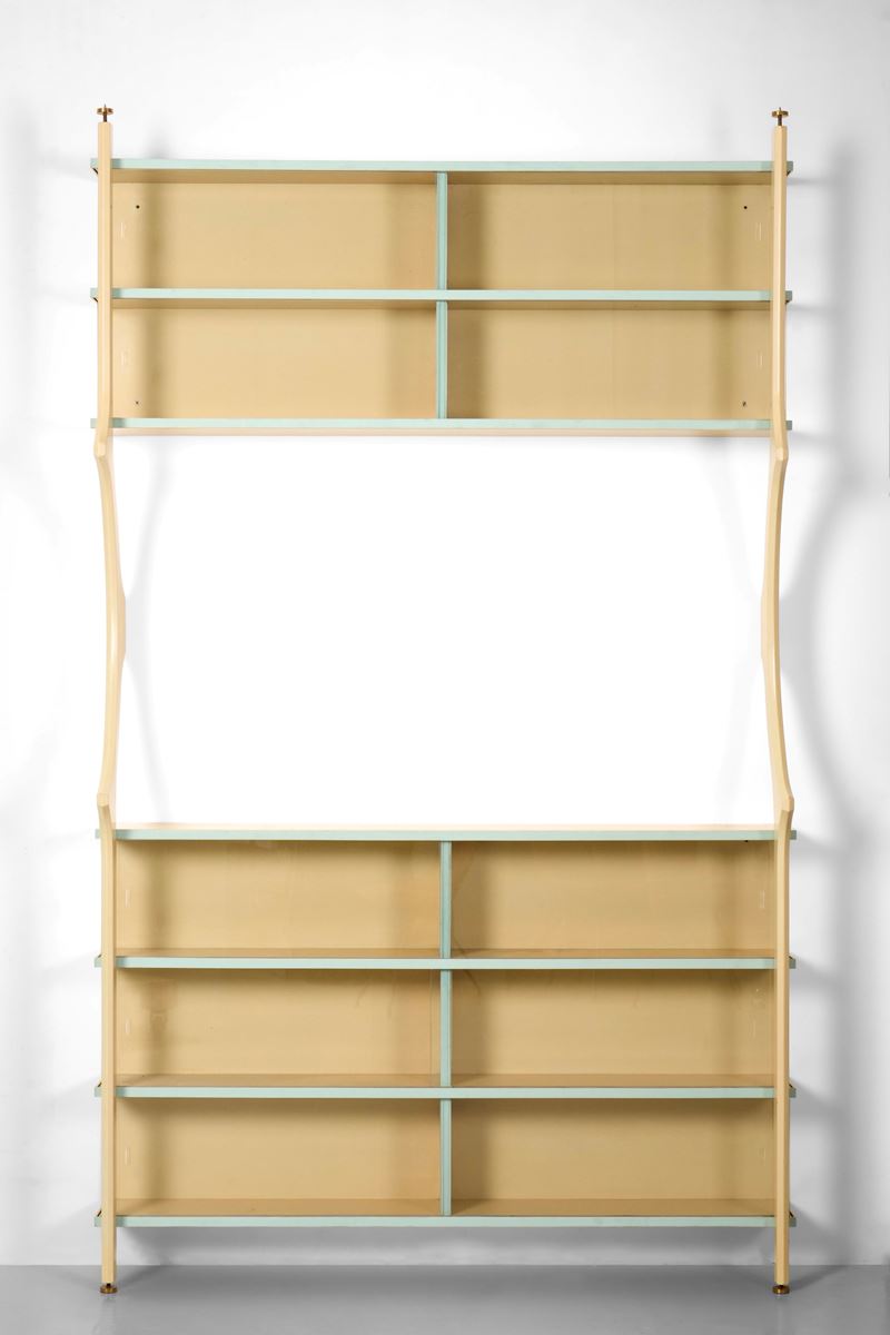 Struttura in legno laccato e ante scorrevoli in cristallo molato, particolari in ottone.