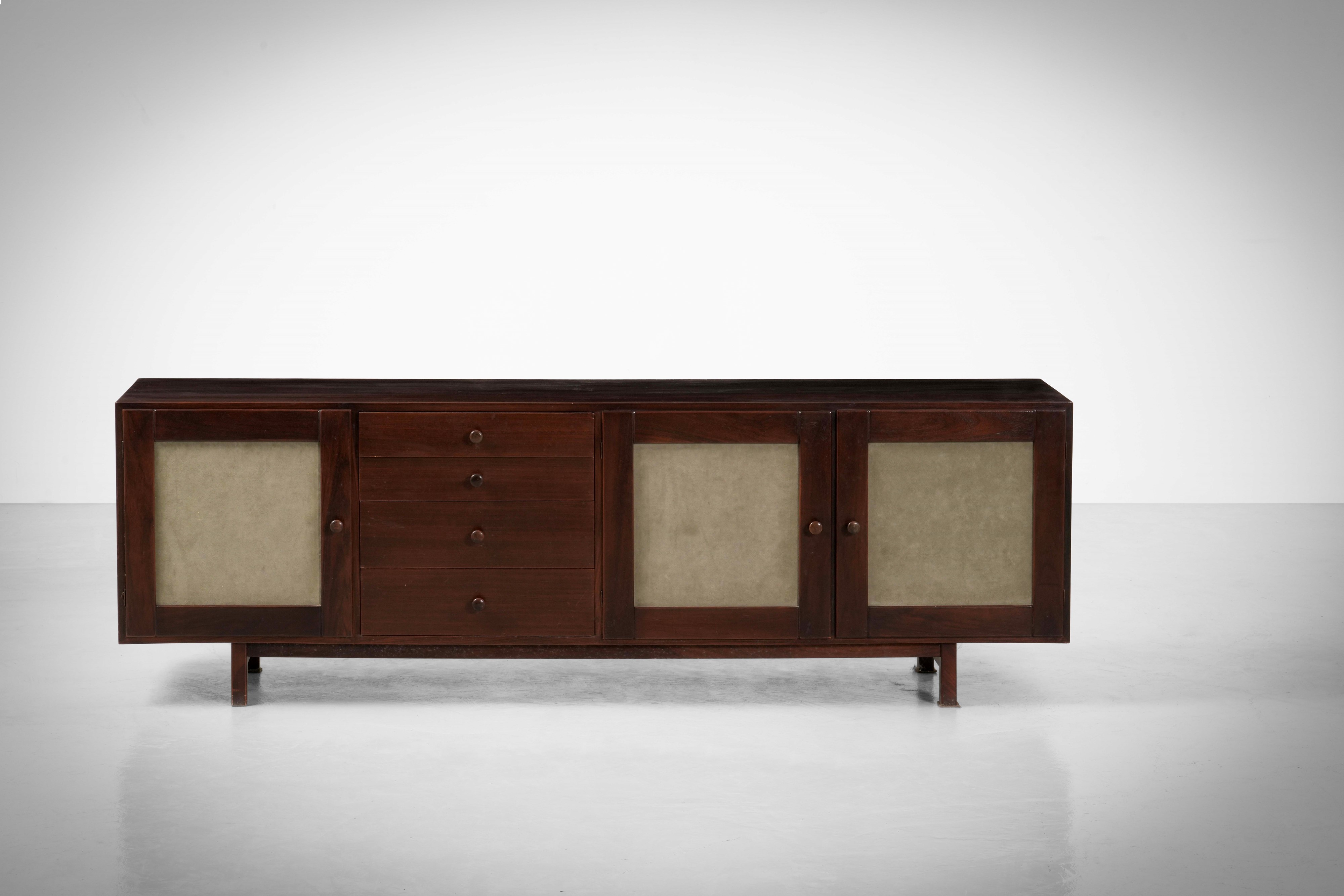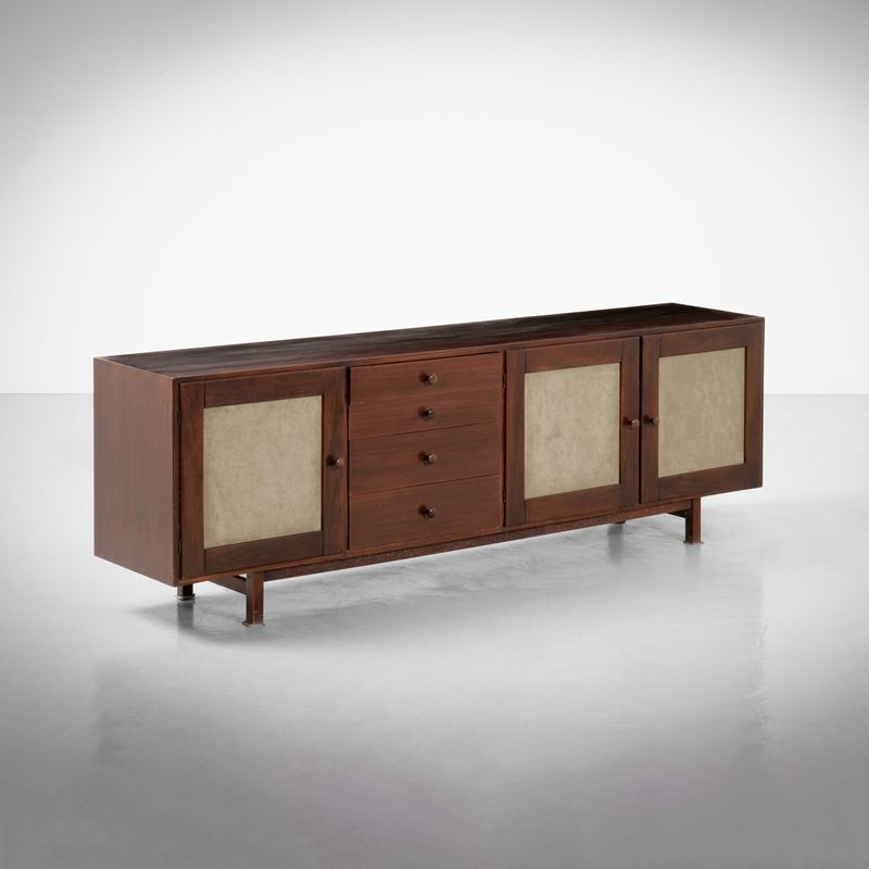 Struttura, cassetti e piano in legno. Ante rivestite di tessuto.