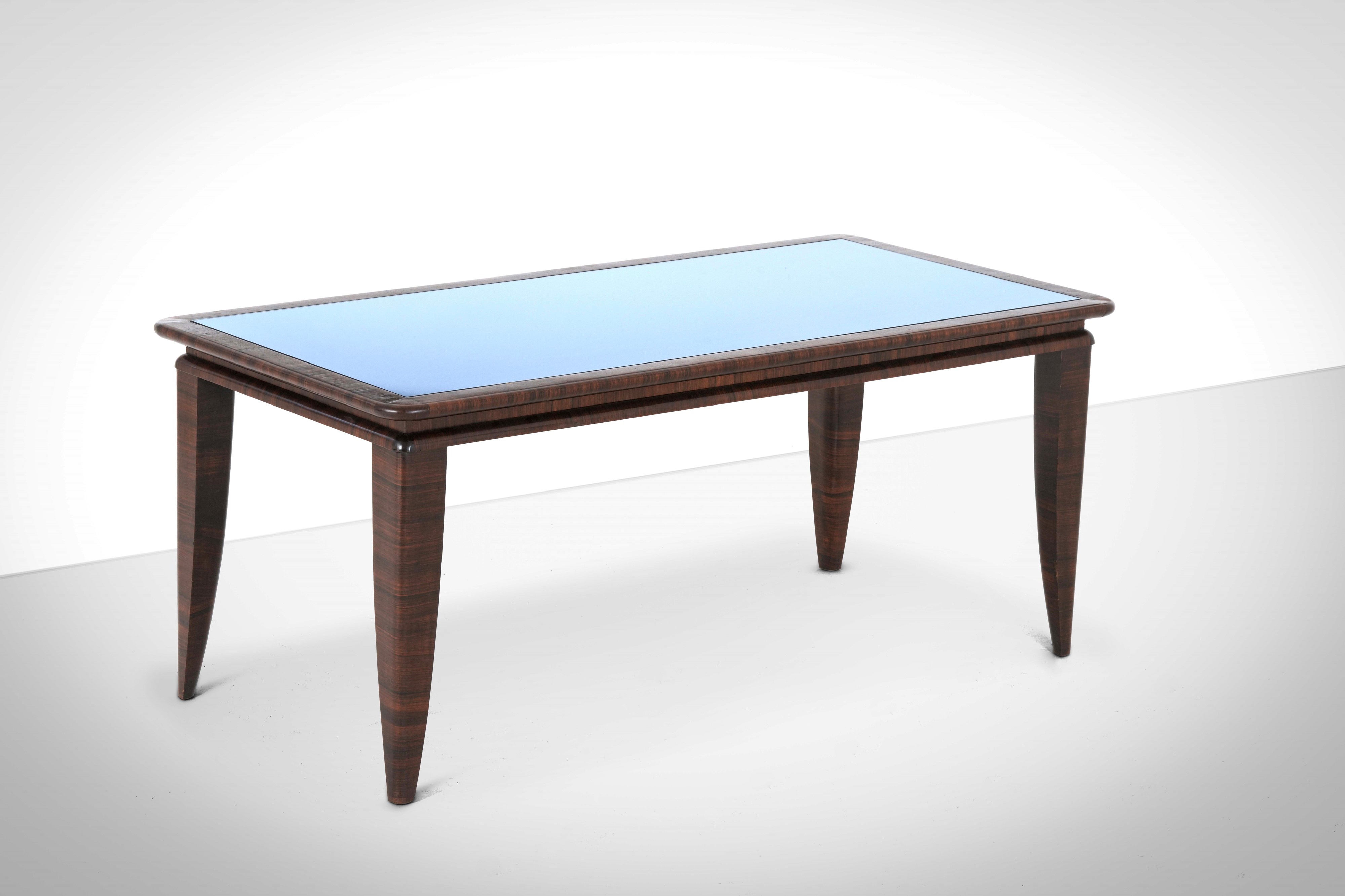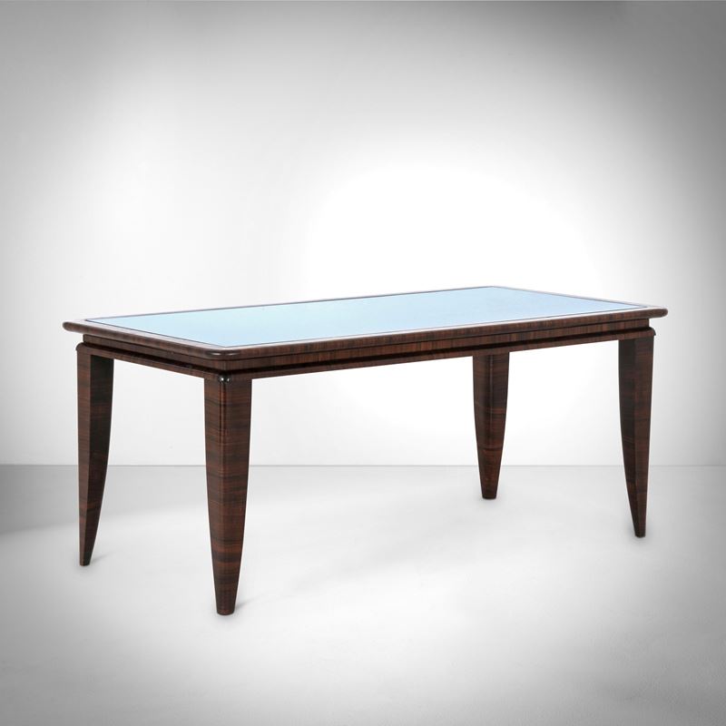 Struttura e sostegni in legno e legno impiallacciato. Piano in cristallo specchiato e colorato.