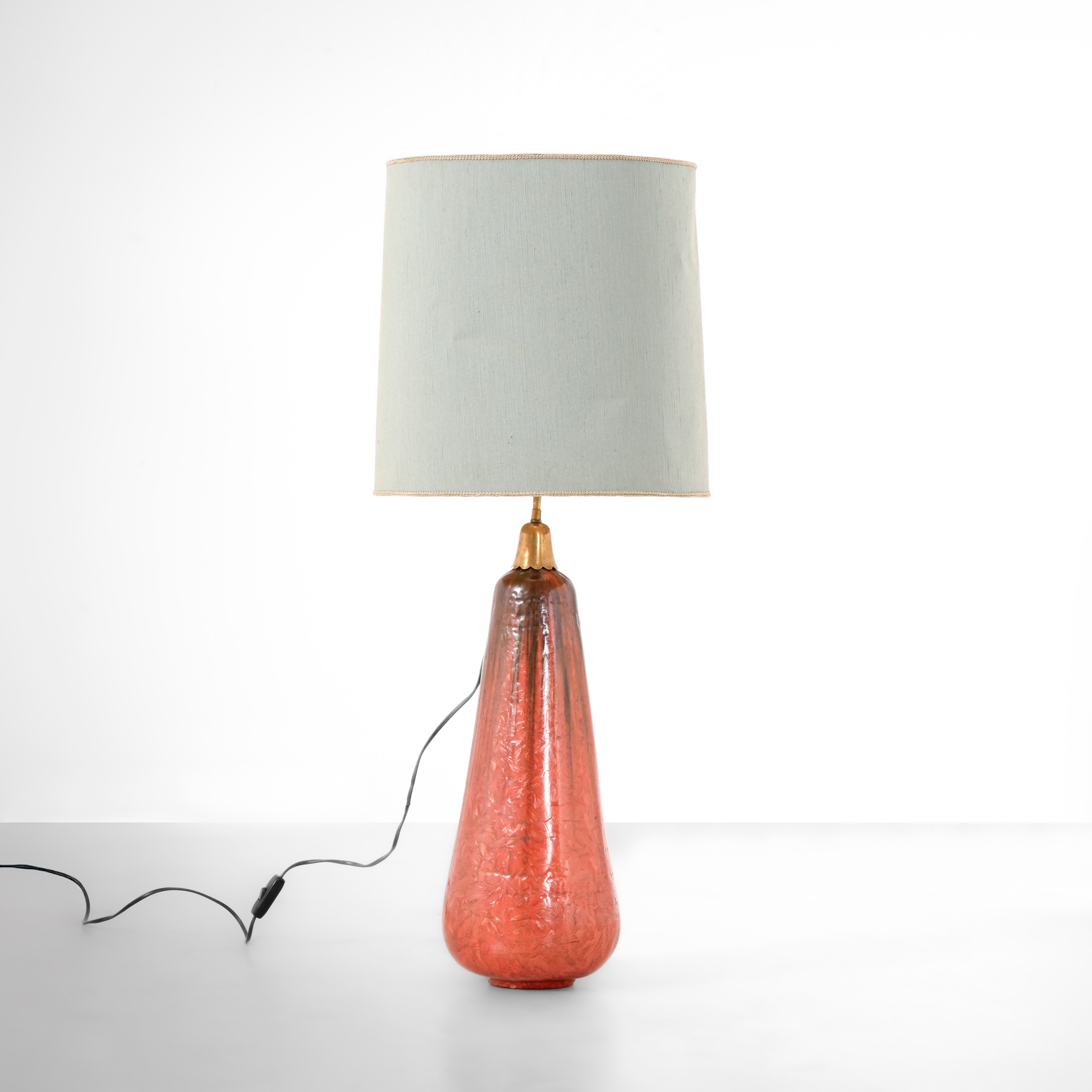 Struttura in ceramica smaltata e ottone con paralume in tessuto.