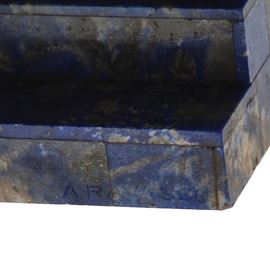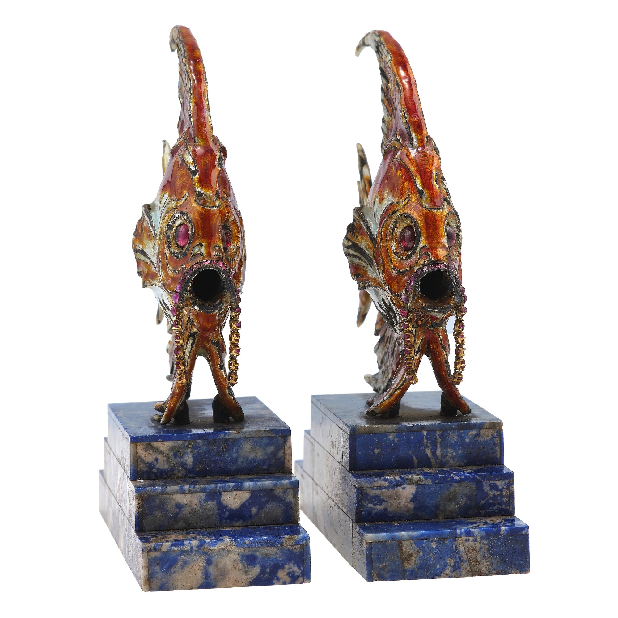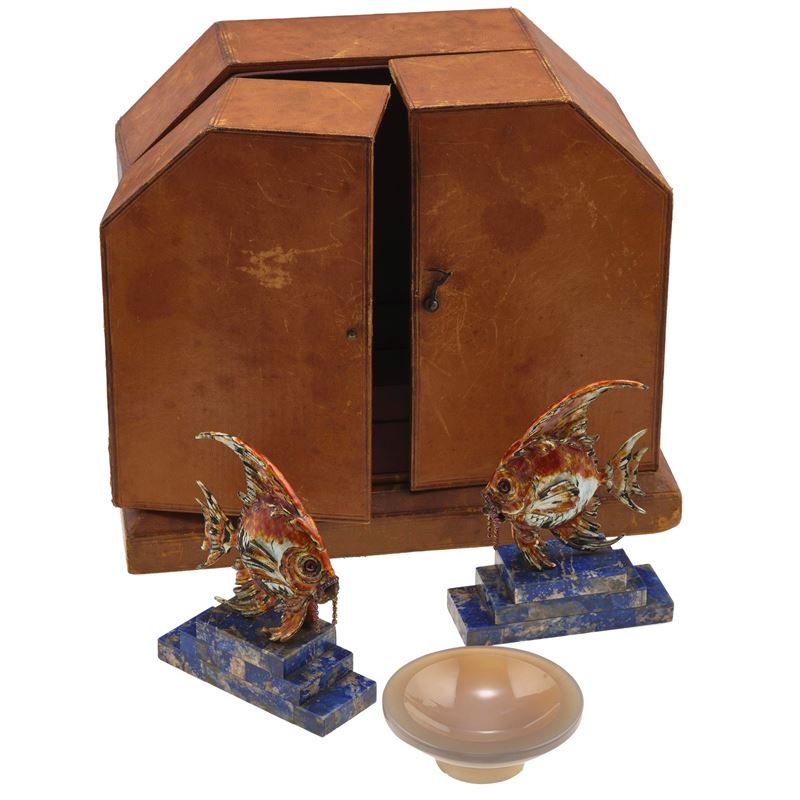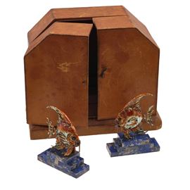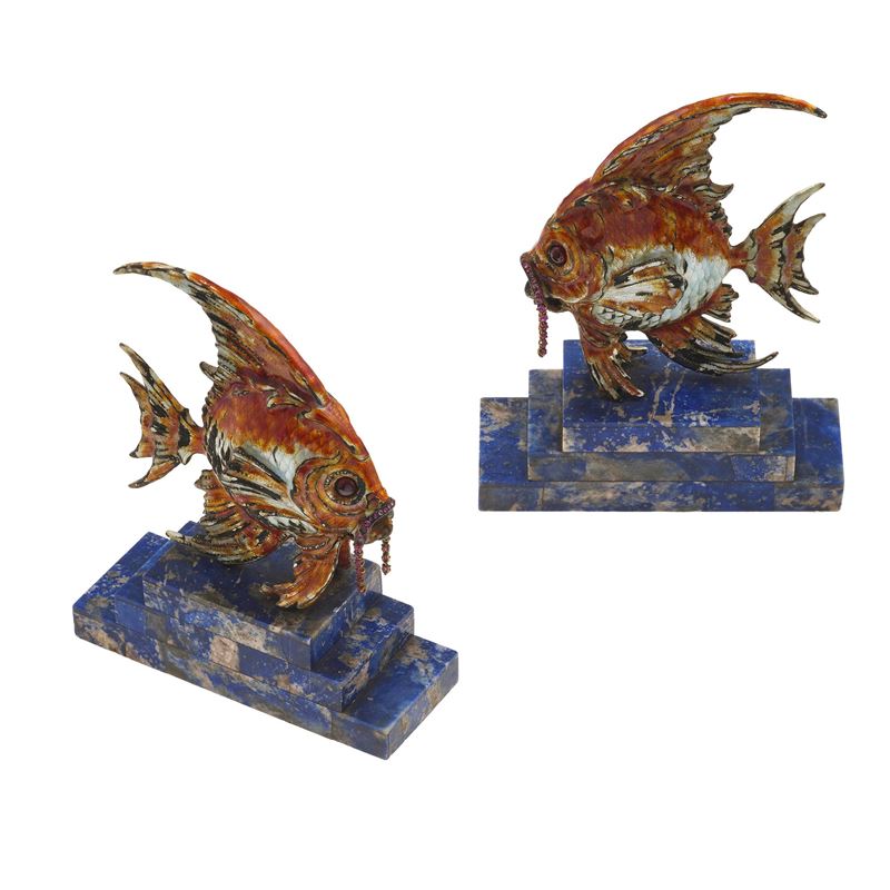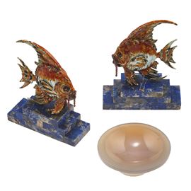 A. Ravasco. Trittico composto da due pesci in metallo dorato, decorati con smalti policromi e impreziositi da piccoli rubini cabochon, su basi in lapislazzuli, accompagnati da una coppetta in agata