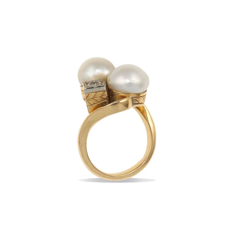 Anello con due perle naturali, a bottone, e due piccoli diamanti di vecchio taglio