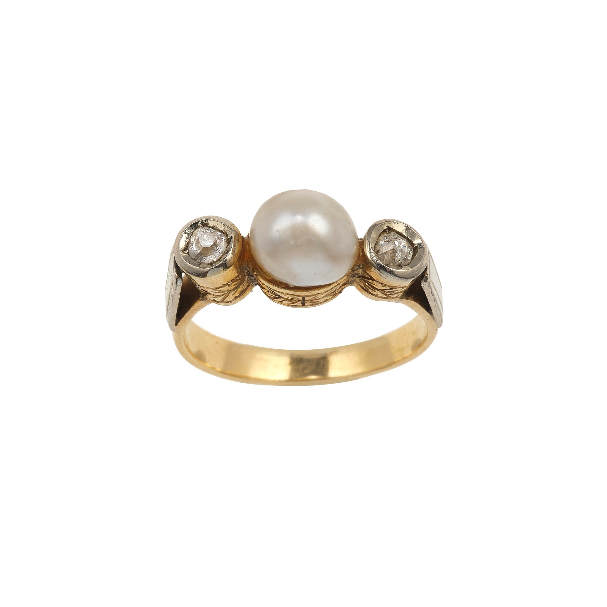 Anello con perla naturale e due diamanti di vecchio taglio