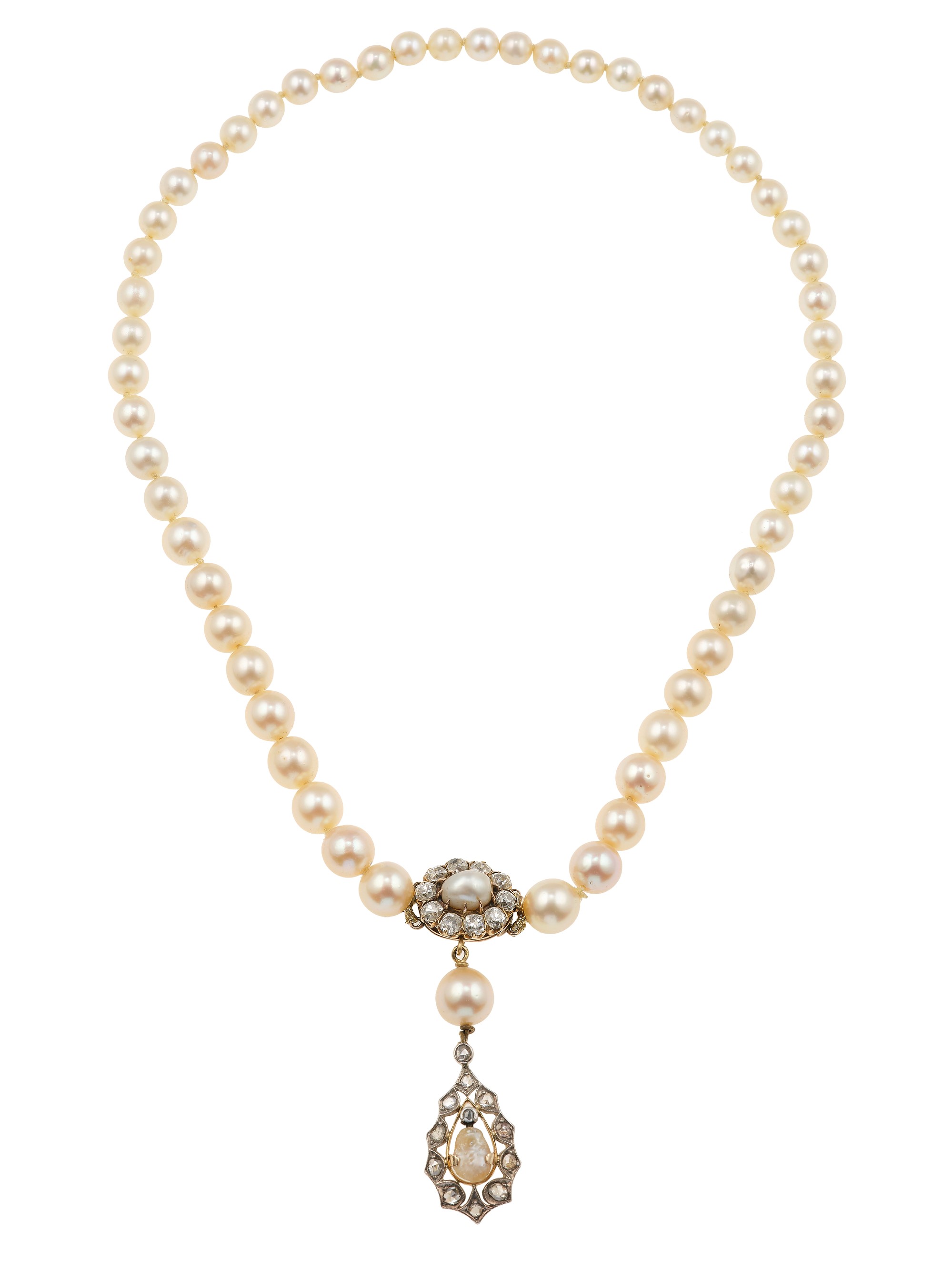 Collana con perle coltivate e diamanti di vecchio taglio