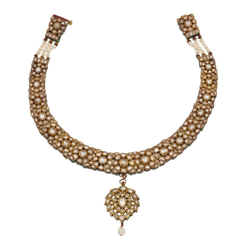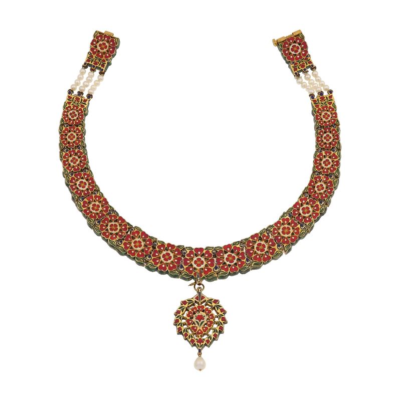 Collana in oro con smalti policromi, diamanti "flat-cut" e perle