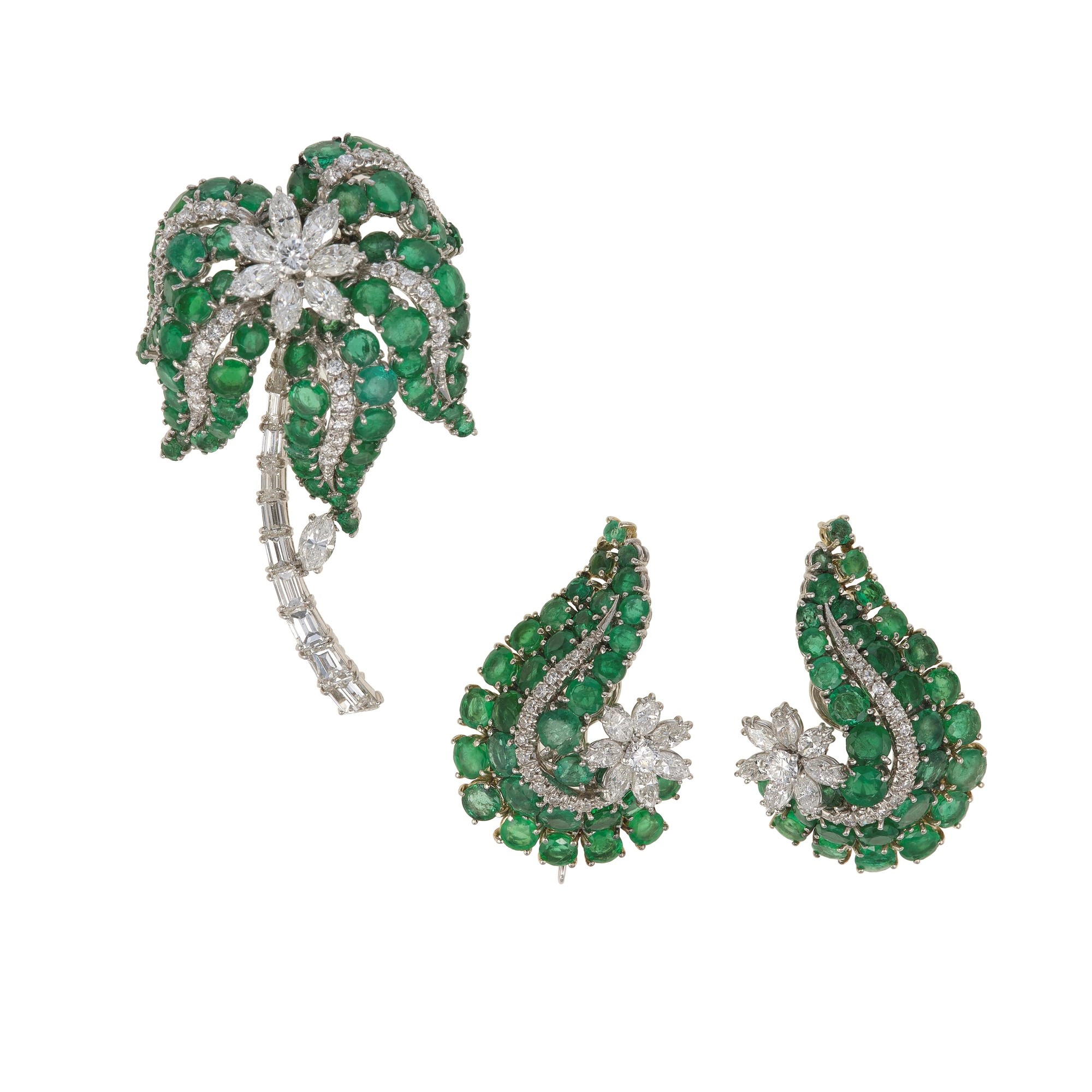 Demi-parure composta da spilla ed orecchini con diamanti e smeraldi