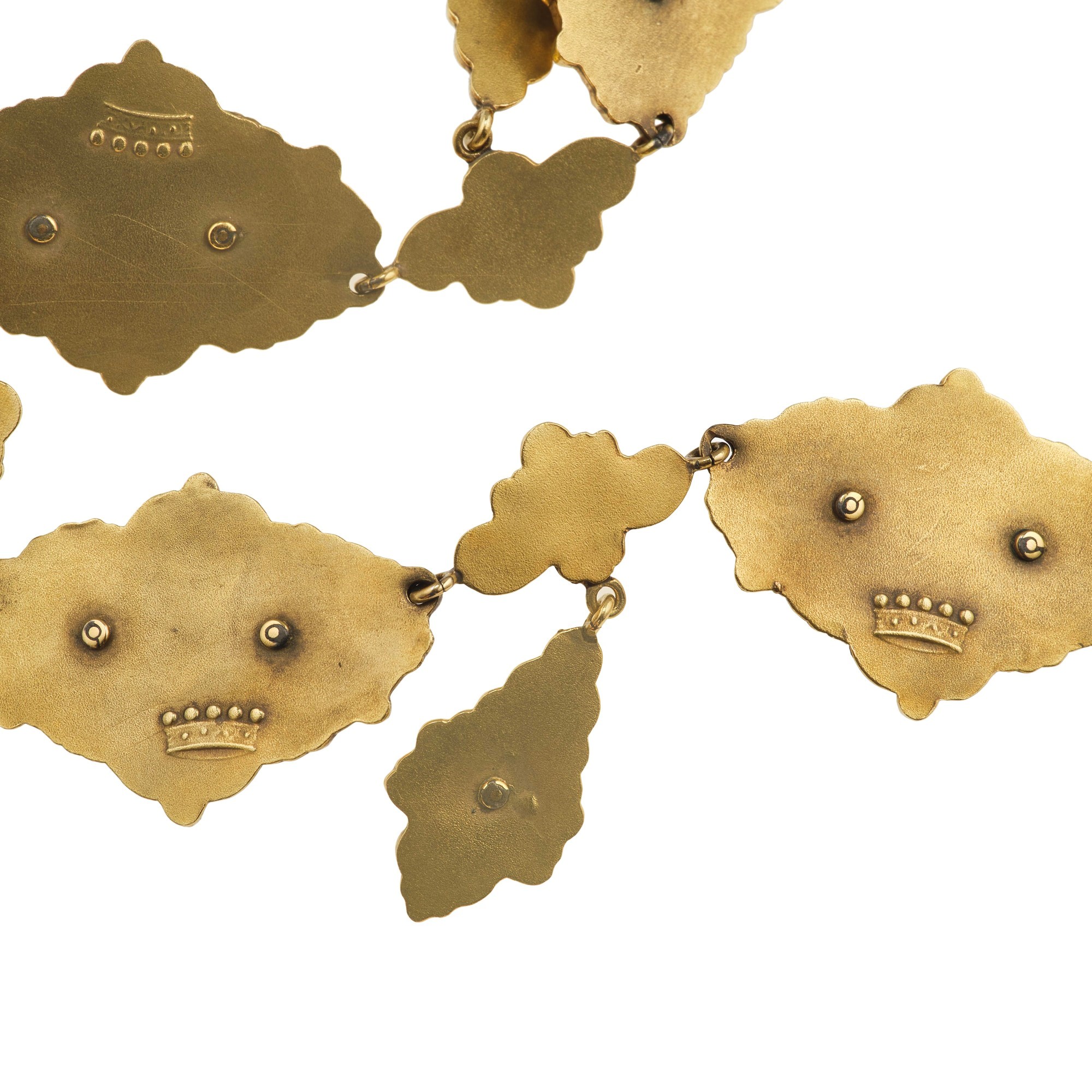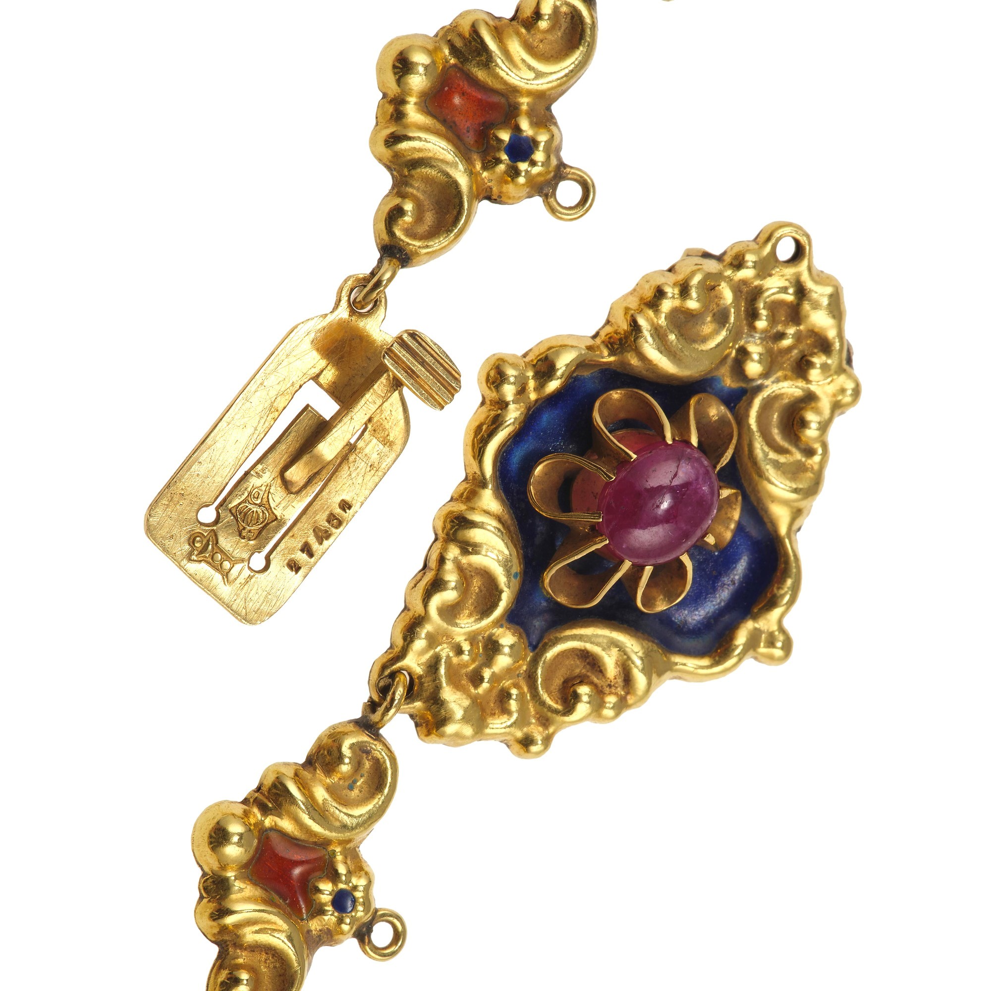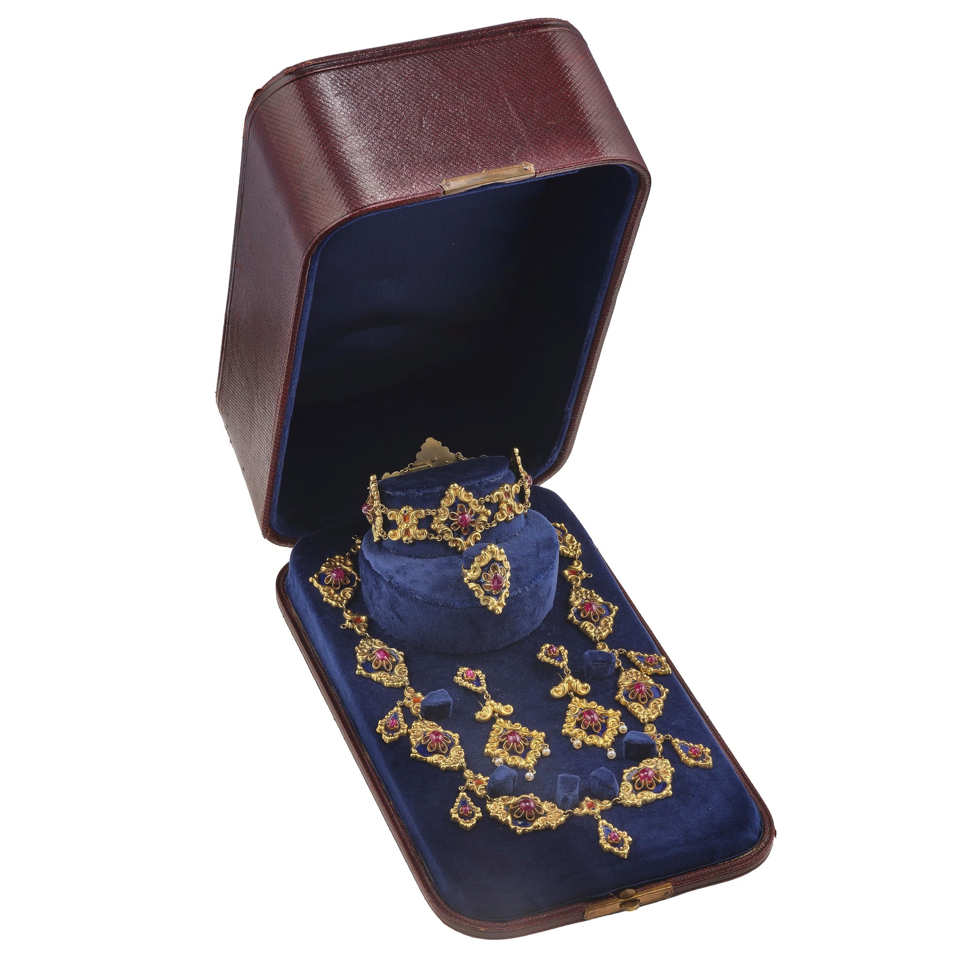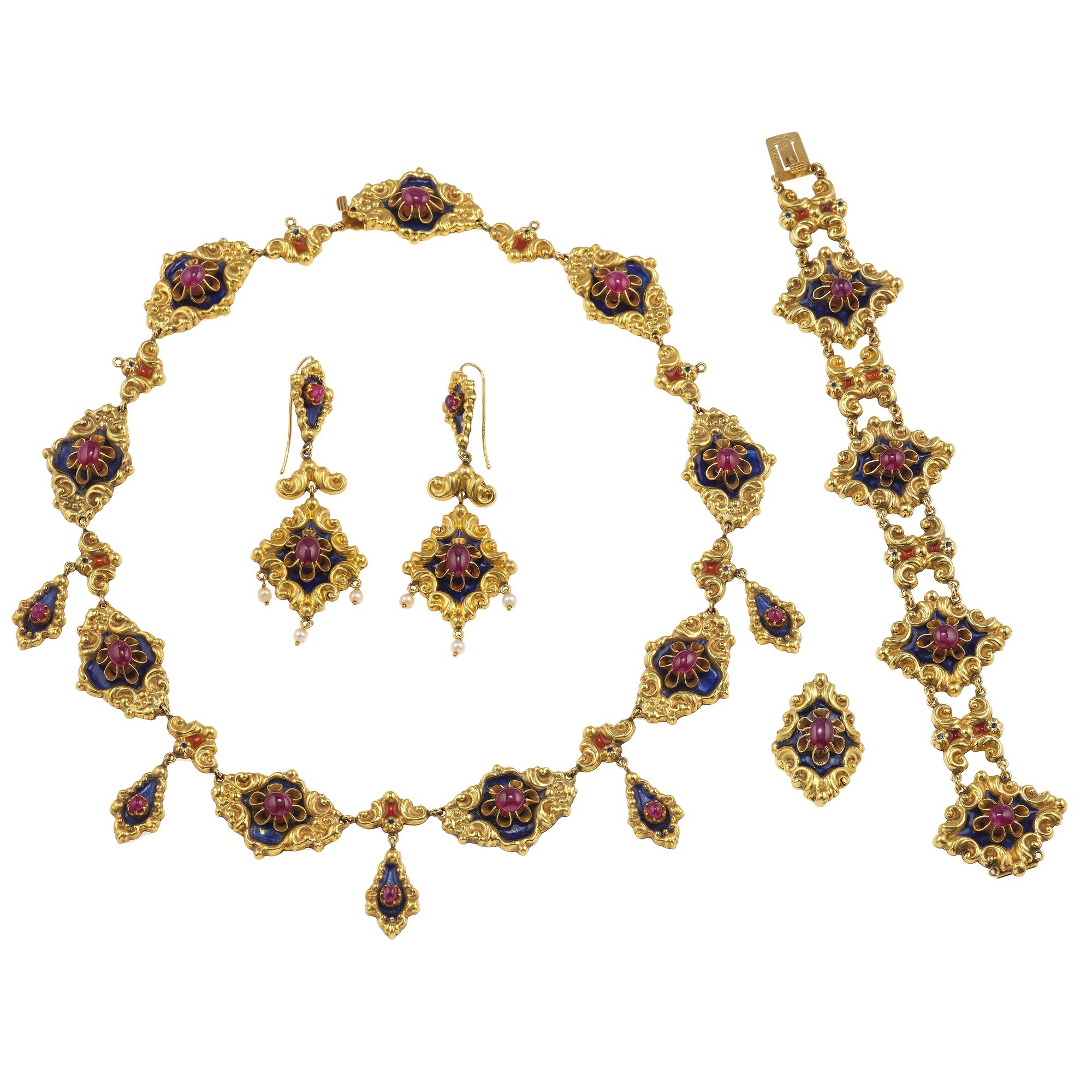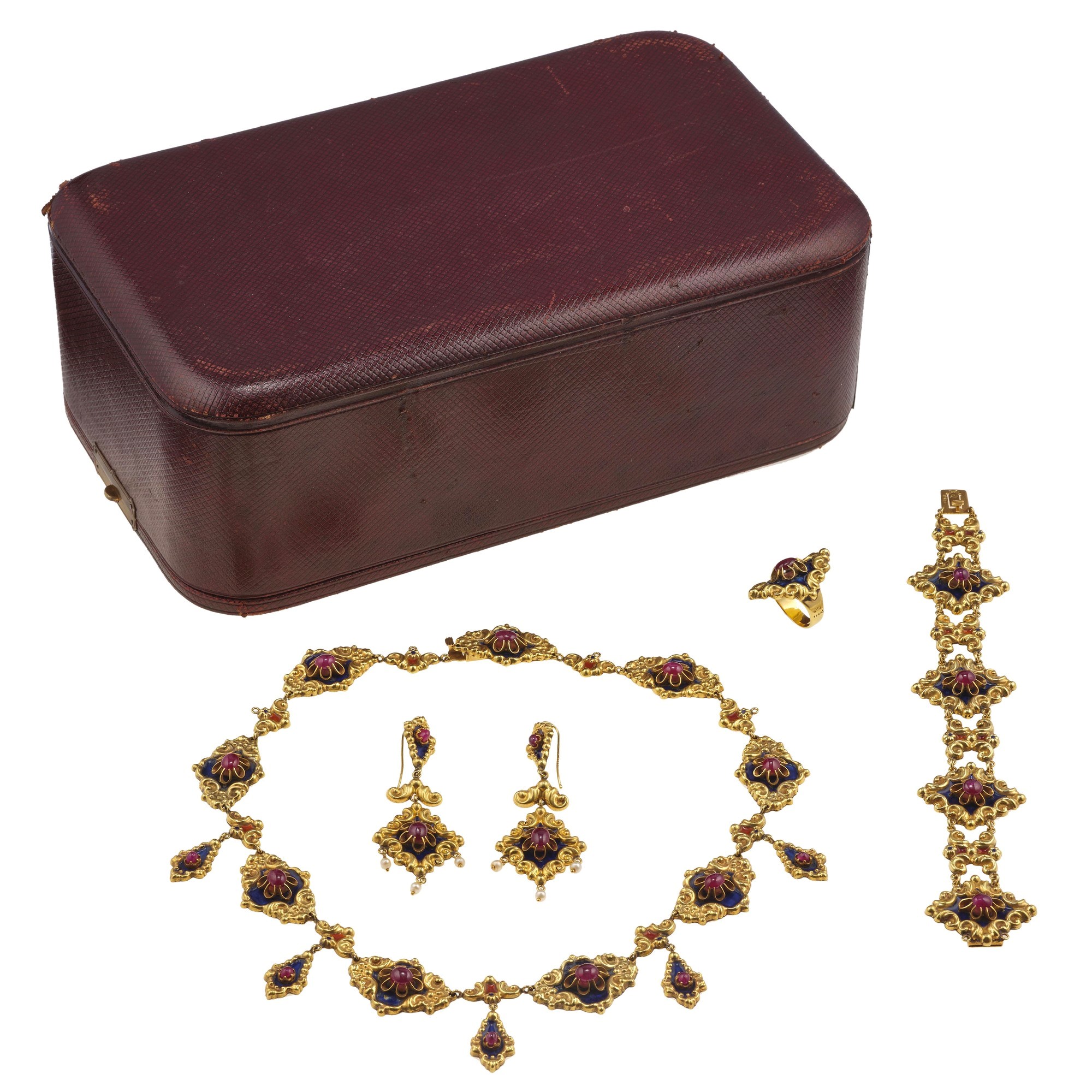 Parure composta da collana, bracciale, anello e orecchini con perline, rubini taglio cabochon e smalto blu