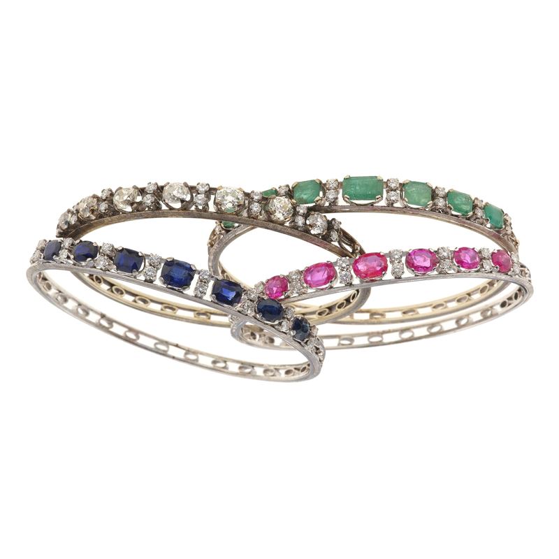 Quattro bracciali rigidi con diamanti, rubini, zaffiri e smeraldi