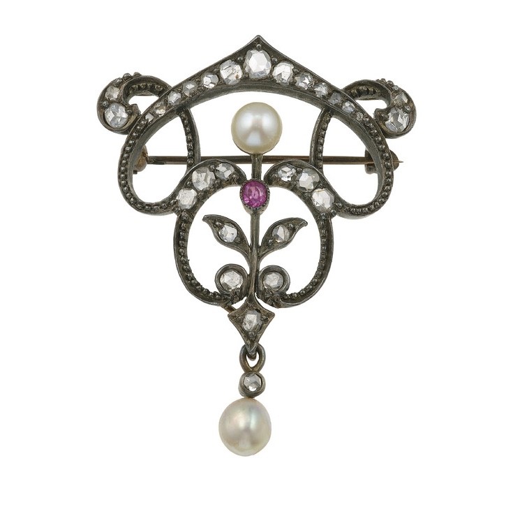 Spilla/pendente con rubino, perle e diamanti taglio rosa