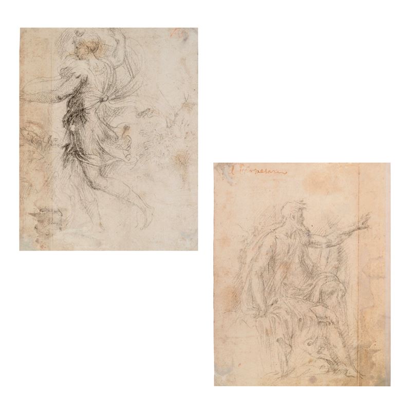 I due bozzetti sono infatti chiaramente ricollegabili a un piccolo gruppo di studi a matita riuniti da Popham (1971, pp. 16-17) sotto l'etichetta di «metal point series» per il legame con alcune incisioni di formato ridotto, siglate con l'appellativo «F.P.». Si tratta, com'è noto, di disegni eseguiti su ritagli di fogli delle dimensioni di carte da gioco, la cui superficie è occupata quasi per intero da una singola figura, con un minimo accenno di ambientazione.