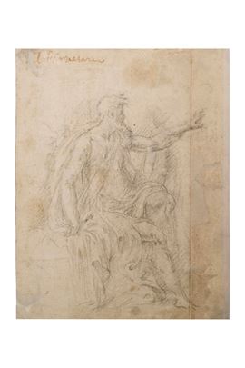 Il Filosofo sul verso del foglio in esame appare infatti in stretto rapporto con due disegni autografi del gruppo, oggi nelle raccolte del Louvre (inv. RF 6504 e RF 583r, Popham 1971, nn. 416 e 417). La freschezza e l'immediatezza del tratto, e la presenza di alcune varianti nella composizione (come le pieghe del drappo ricadente verso il suolo, la posizione leggermente diversa del «profilo perduto» del volto e l'inclinazione del braccio destro, più sollevato rispetto a entrambi i fogli parigini) collocano il disegno in esame ancora nella fase di ideazione preliminare, escludendo che si tratti di un d'apres.